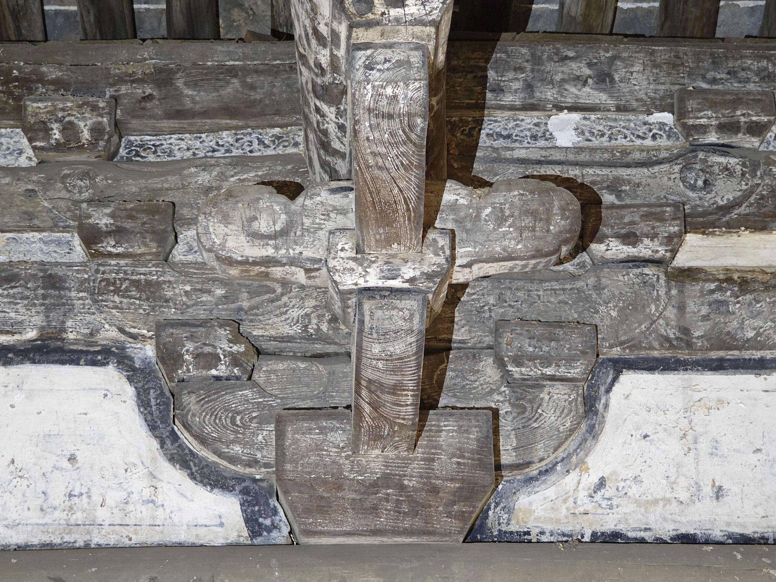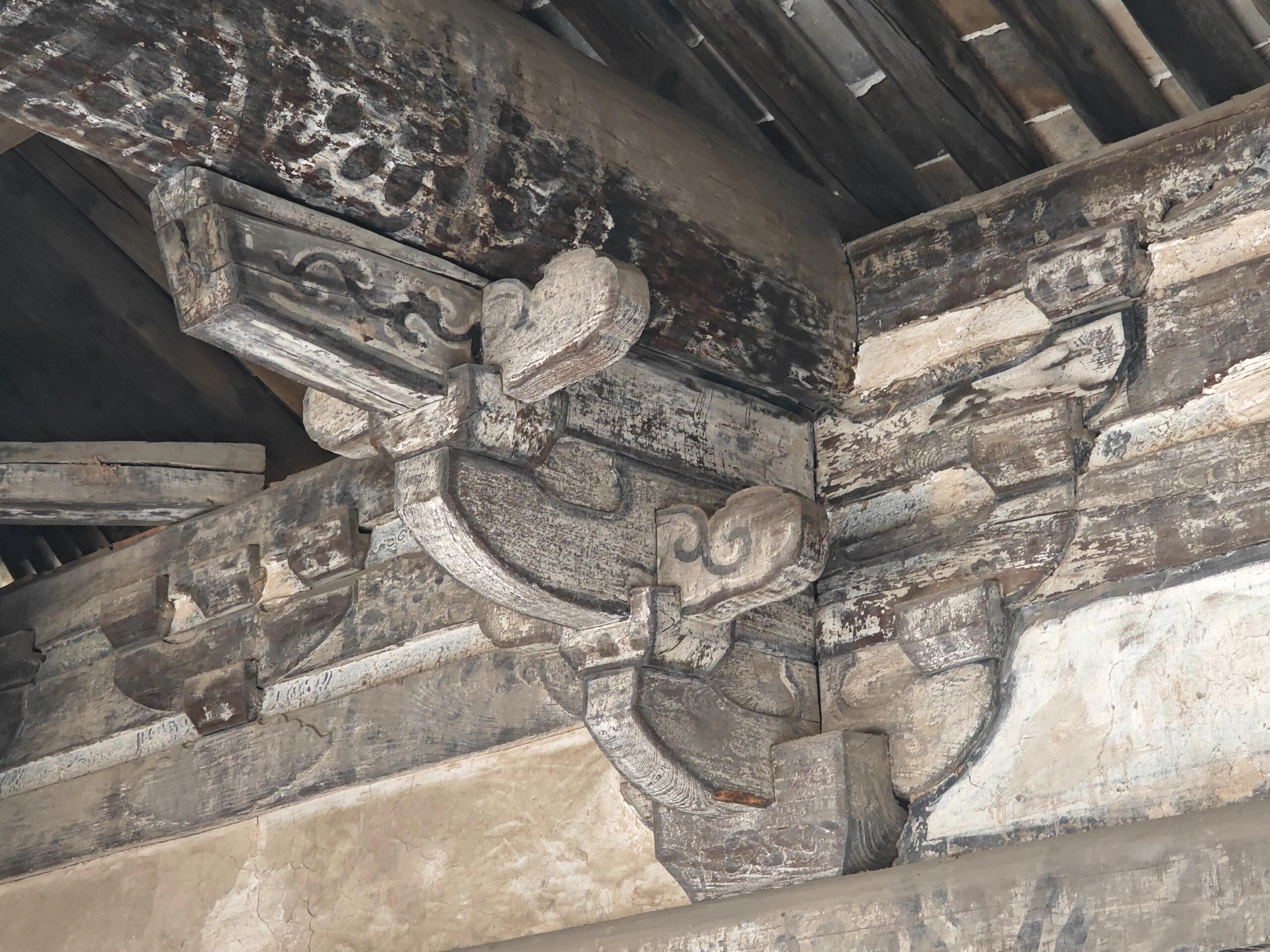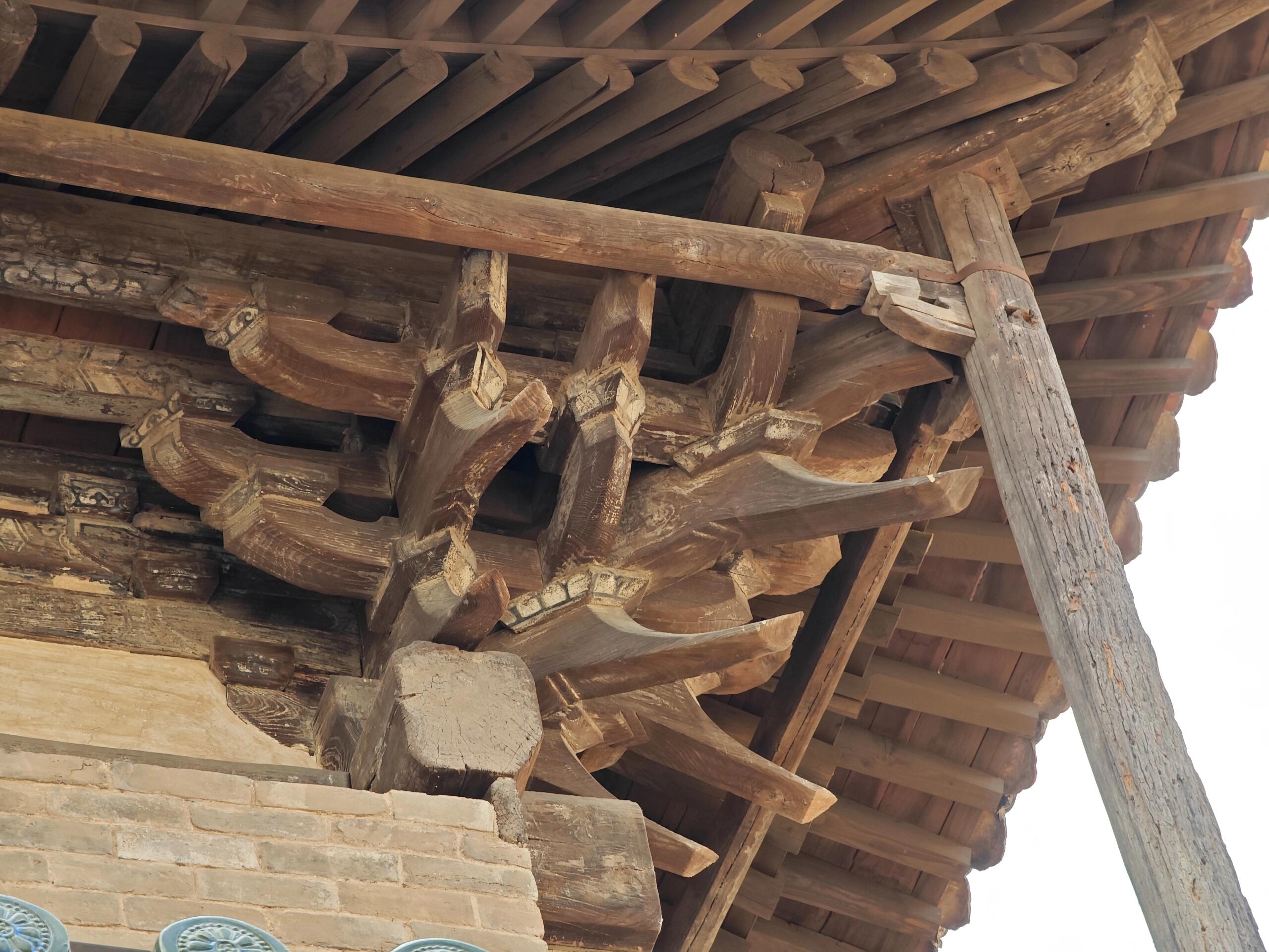 初见藏经楼,最先被吸引的是它古朴的外观。二层楼阁式建筑在晋东南并不多见,尤其是这种沿袭金元风格的形制,更是少见。底层外墙用青砖砌成,砖块之间的缝隙里长满了青苔,手抚上去,能感受到岁月的粗糙质感。墙角处的砖块有些许剥落,露出里面颜色略深的土坯,像是历史不经意间露出的内里。二层的木构部分更为精彩,木质的檐柱微微向里倾斜,这是金元建筑中常见的“侧脚”做法,不仅让建筑在视觉上更显稳固,更暗含着古代工匠对力学的深刻理解。檐下的斗拱虽不如唐代建筑那般硕大,但依旧保留着元代的雄浑气息,五铺作单抄单下昂的结构,层层叠叠,像是一组被精心设计的几何图案,既承担着支撑屋檐的实用功能,又兼具装饰性。