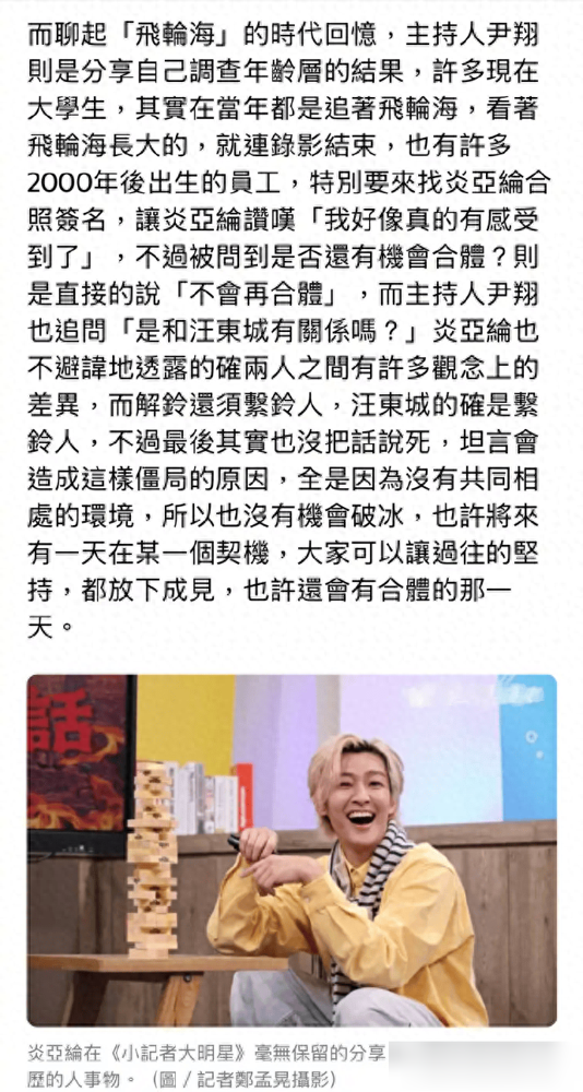 被问及五小只之间不和的原因。近日,炎亚纶在参加一档综艺节目时被问:你觉得飞轮海还会再次合体吗?