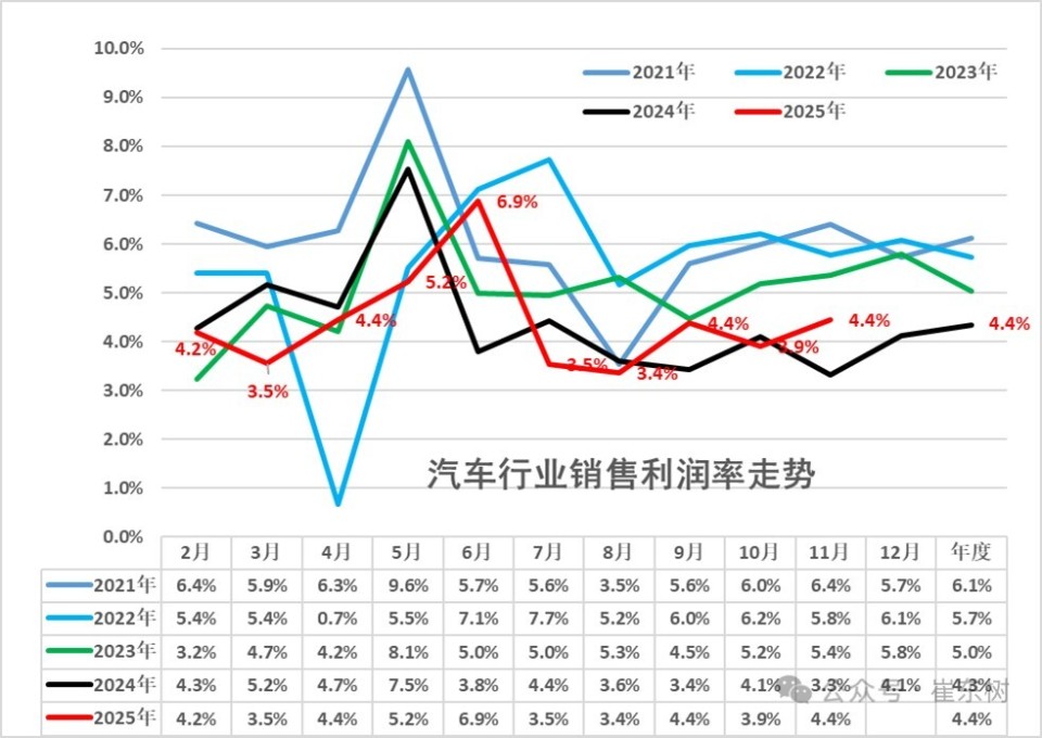 乘联会崔东树披露,2025年1—11月汽车行业利润率约4.4%,仍低于规模以上工业企业平均水平。