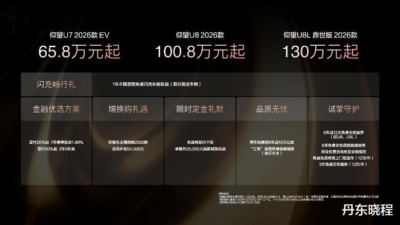 仰望 2026 款全系实现:U7 EV 纯电续航1006km;U8 综合续航1205km,提升 20.5%;