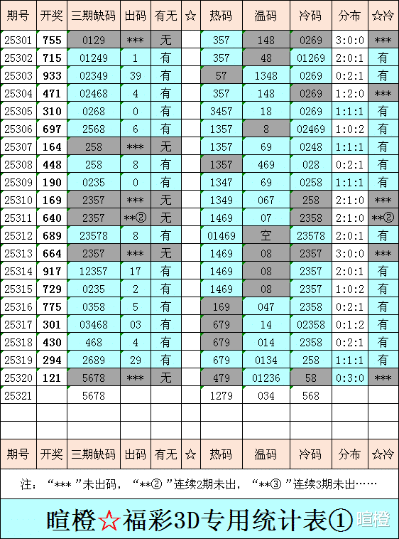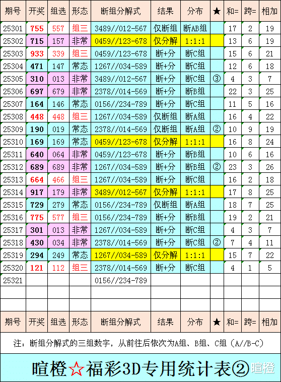 25321期:暄橙福彩3D综合条件(上期未发)(本期将在12月1日21:15开)一、上期回顾 ☆1、上期开奖号:1 2 1。2、和值= 4,跨度= 1。3、组三形态,112路组合。4、热度分布(热:温:冷)0:3:0。二、本期条件 ☆1、三期缺码:5678。2、热:1279,温:034,冷:568。3、断组分解式:0156//234-789。4、四胆:2468;三胆:248。三、术语解释 ☆1、三期缺码:0至9这十个自然数当中,未在近三期开奖号出现的数字。2、热度(热温冷):自然数0至9,在近七期开奖号中,出现3次及3次以上的数字,称为热码;出现2次的数字,称为温码;出现1次和未出现的数字,称为冷码。某个数字在开奖号中出现几个,就按几次计算。3、断组分解式:将0至9这十个自然数,分成三组数字,从前往后依次为A组(4码)、B组(3码)、C组(3码),一般情况下,有一组数字不出码,偶尔会有两组数字不出码。A组不出码的情况相对较少。断组为主,分解为辅。4、常态组六号码:同时包含大数、小数、奇数、偶数、质数、合数的组六号码,共有72注。统计表中,简称“常态”。5、非常态组六号码:全大数、全小数、全奇数、全偶数、全质数、全合数等六种形态的组六号码,共有48注。统计表中,简称“非常”。★提醒:彩市有风险,参与须谨慎!理性购彩,量力而行!多看少买,不要痴迷!任何条件都有出错的时候!水平有限,仅供参考!友好互动,好运相伴!