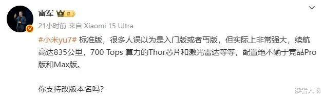 雷军在投票里特意解释,好多用户看到“标准版”就觉得是入门款、“丐版”,但实际上这款车配置真挺能打的。