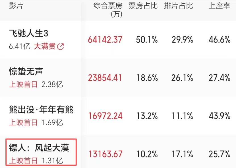 首映当日,影片的日票房仅有1.3亿,位列第四,连《熊出没·年年有熊》都没“打”过。