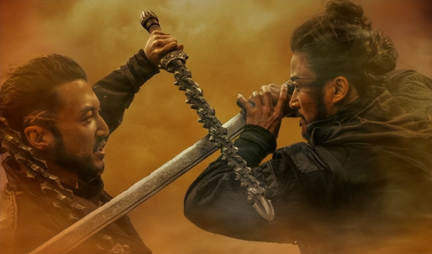 在沙暴中,吴京和谢霆锋双鞭与长刀逆风中借力发力,兵器撞击声与风啸声交织,这才是武侠片打戏的正确打开方式。