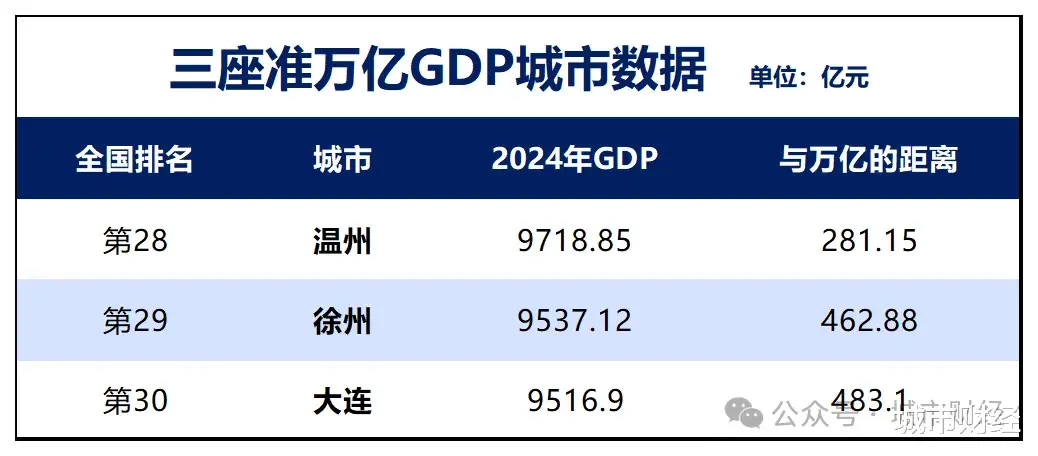一方面,大连和徐州2024年GDP与万亿差距也很小。
