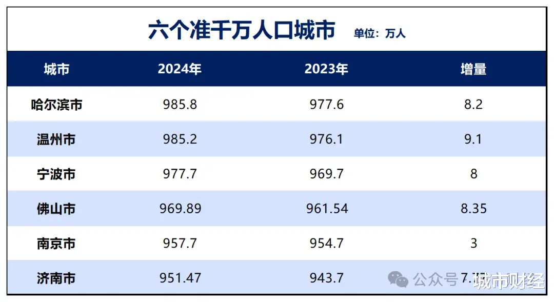 从现有的人口规模来看,以950万人为界线,有6个后备军,按照规模排序分别是哈尔滨、温州、宁波、佛山、南京、济南。