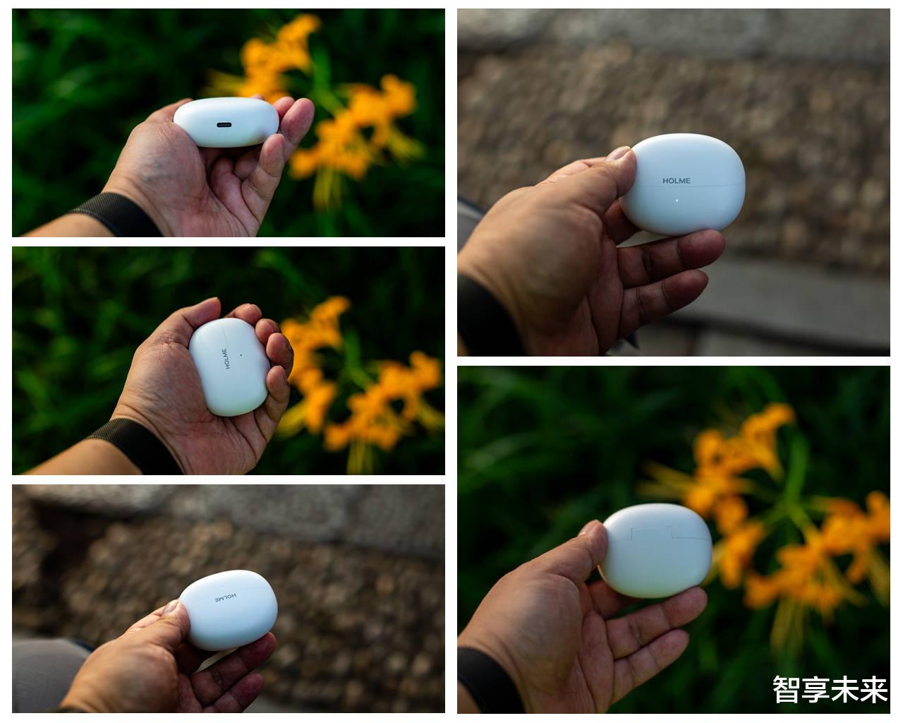 虹觅 Air2耳夹式蓝牙耳机的充电盒,哑光白色,扁圆形,没有棱角,重约32g,便于携带,安全性也比较好。因其小巧光滑,平时也可以当一个小巧的把玩件。充电盒正中可以看到HOLME的灰色LOGO,其下是一个很小的白色指示灯。底部有一个TypeC的USB充电口。充电盒电池容量250mAgh,大概可以为耳机提供大约3次左右的续航,使耳机的整体续航能力达到8+24小时,可满足一天的使用需求。