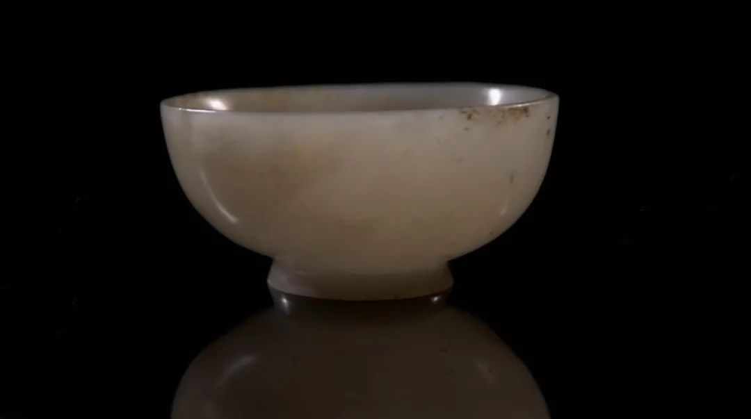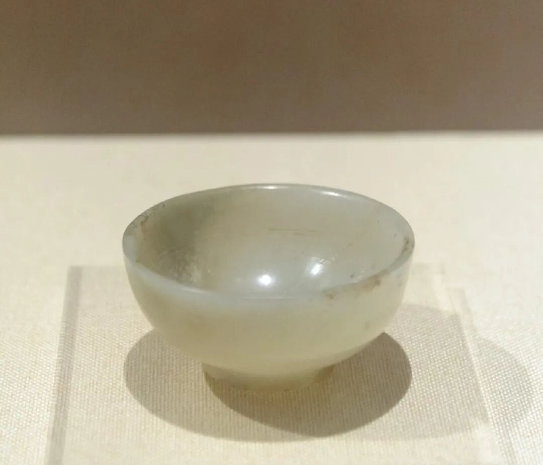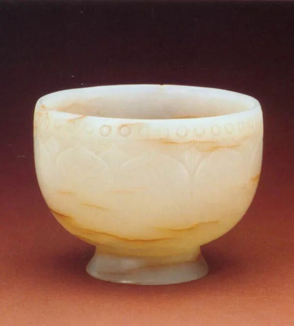 隋唐之际此类玉杯存世较少,敞口、圈足形的有1957年西安市李静训墓出土的金扣玉杯和故宫博物院藏莲瓣纹玉杯等,都是唐代容器之珍品。