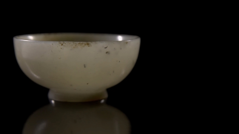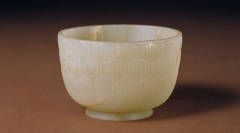 然而当你以为这件白玉杯与上述这些玉杯一般用来饮酒或饮茶就大错特错了。当调整视线角度看向玉杯内壁的时候,我们可以看到内腹部施两道弦纹,弦纹下钵腹至底部琢有纵横交错的密集条纹。
