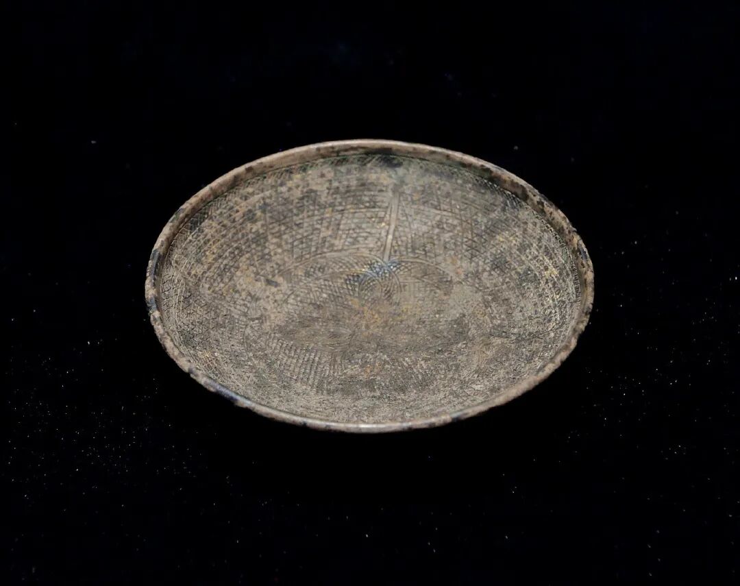 通高5.0cm,口径15.0cm,平底,内壁刻有放射形和花形交错的沟纹图案,既美化器具,又增强磨擦力。