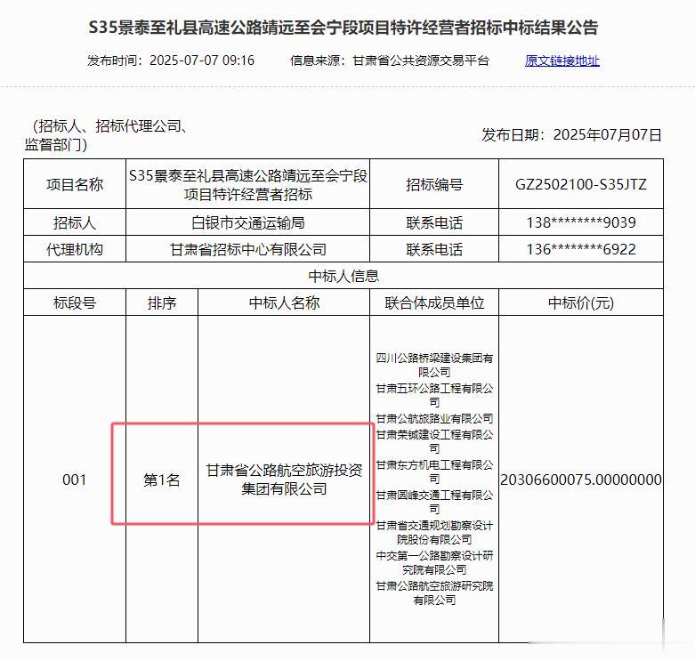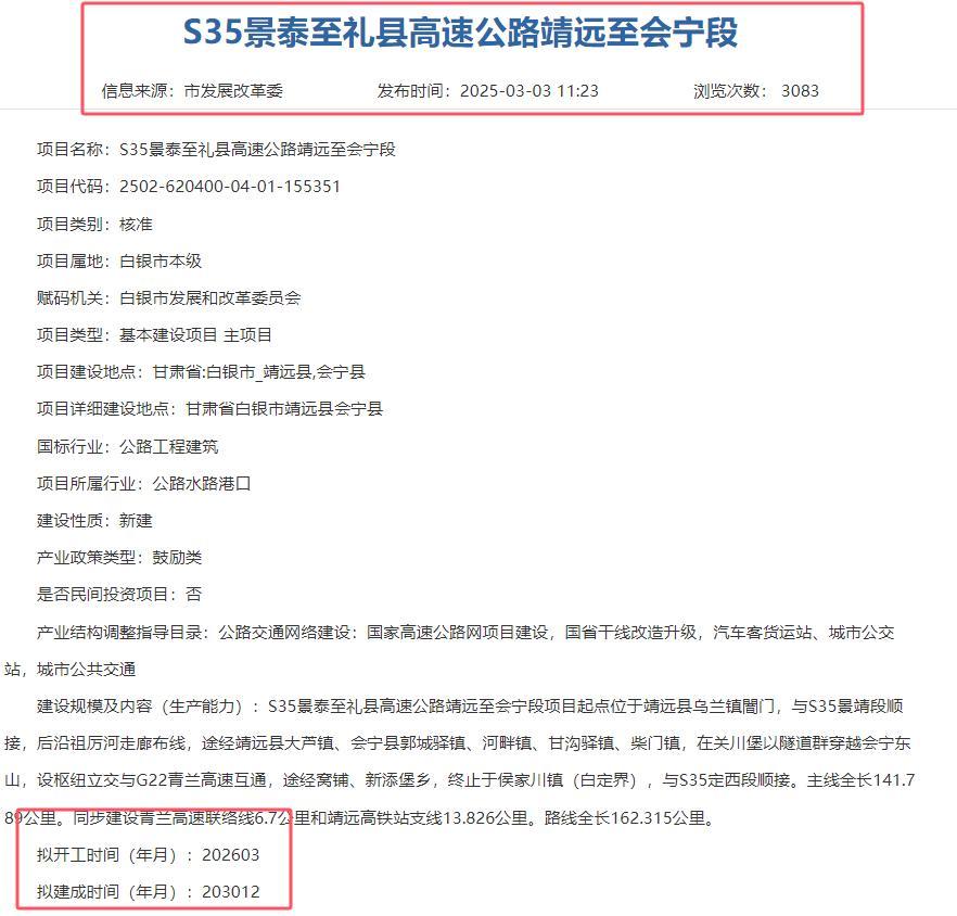 鉴于S35景泰至礼县高速公路靖远至会宁段的建设,能够加快甘肃省白银地区物资流通,对推动新产业培育、带动革命老区经济社会发展具有重大意义,因此,为了支持S35景泰至礼县高速公路靖远至会宁段的建设,一是甘肃省文物局于2025年8月14日,批复了该项目选线涉及文物保护的事项;二是由白银市交通运输局作为招标人,进行该项目的特许经营者招标工作,并成功于2025年7月7日招到了投资人,投资人是以甘肃省公路航空旅游投资集团有限公司作为牵头人的联合体,中标价20306600075.00元,即约203亿。
