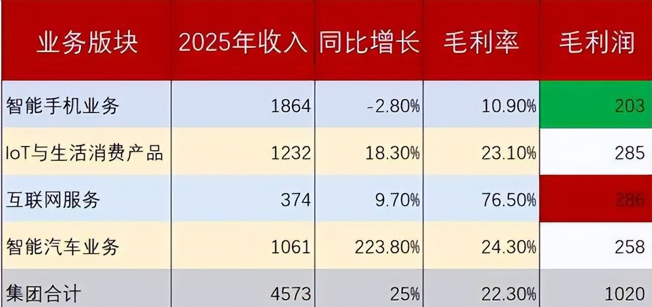 结果挺打脸。手机这块儿毛利才203亿元,连总毛利的五分之一都不到。IoT与生活消费品、互联网服务、还有刚落地不久的汽车业务,哪一块的毛利单拎出来都比它高。你琢磨琢磨,1864亿进账,203亿毛利,算下来毛利率连11%都悬。隔壁互联网服务毛利率72%,汽车业务虽然还在爬坡,但首年毛利已冲到198亿——比手机只少甩5个亿。