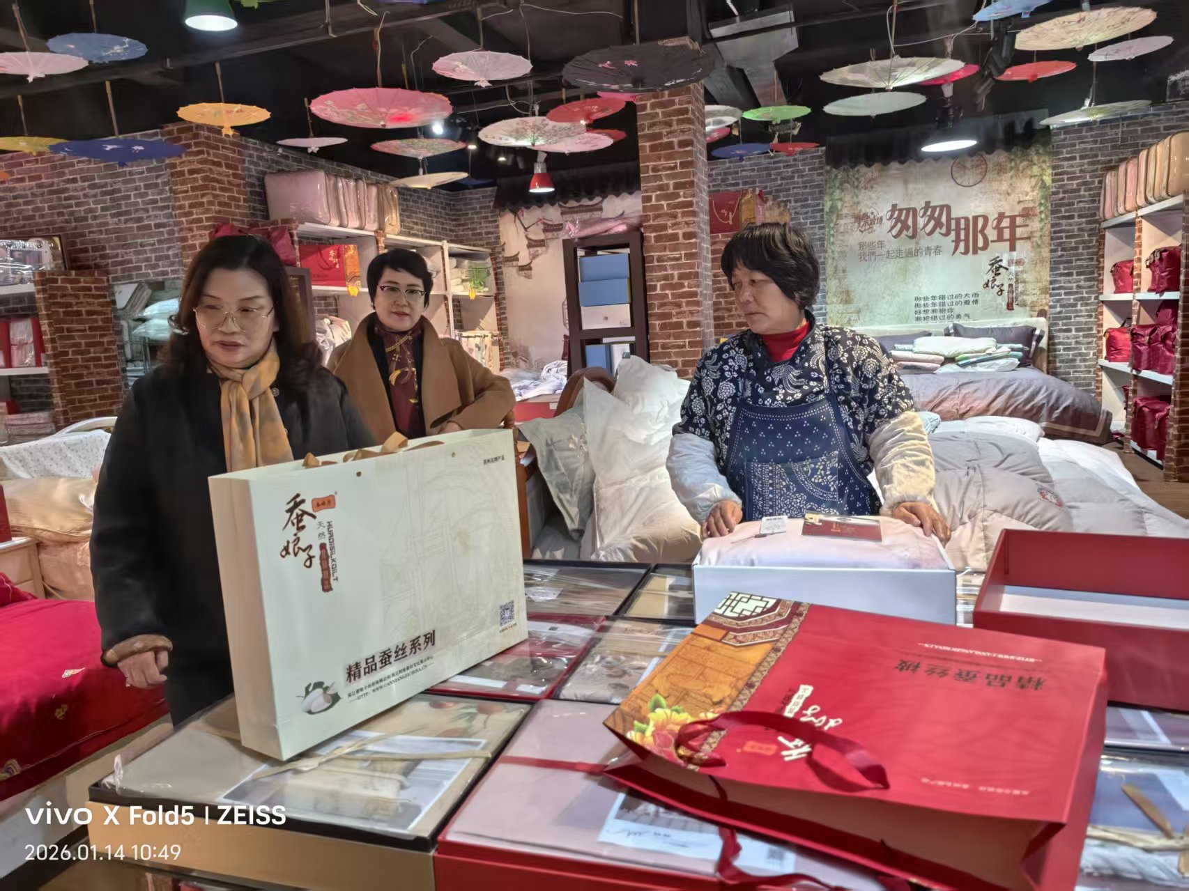 刚踏入蚕娘子章桂芬的展示区,琳琅满目的展品便令人目不暇接:光泽如珍珠的蚕丝被、纹样雅致的蚕丝织物、工艺精巧的蚕桑文创,每一件都透着匠心独运的雅致。待众人落座,会议正式拉开帷幕。天下学子苏州工业园区分会的瞿菊率先登台,回望一年来的步履铿锵,展望2026年的壮阔蓝图,字字句句都饱含着对分会发展的赤诚与期许。
