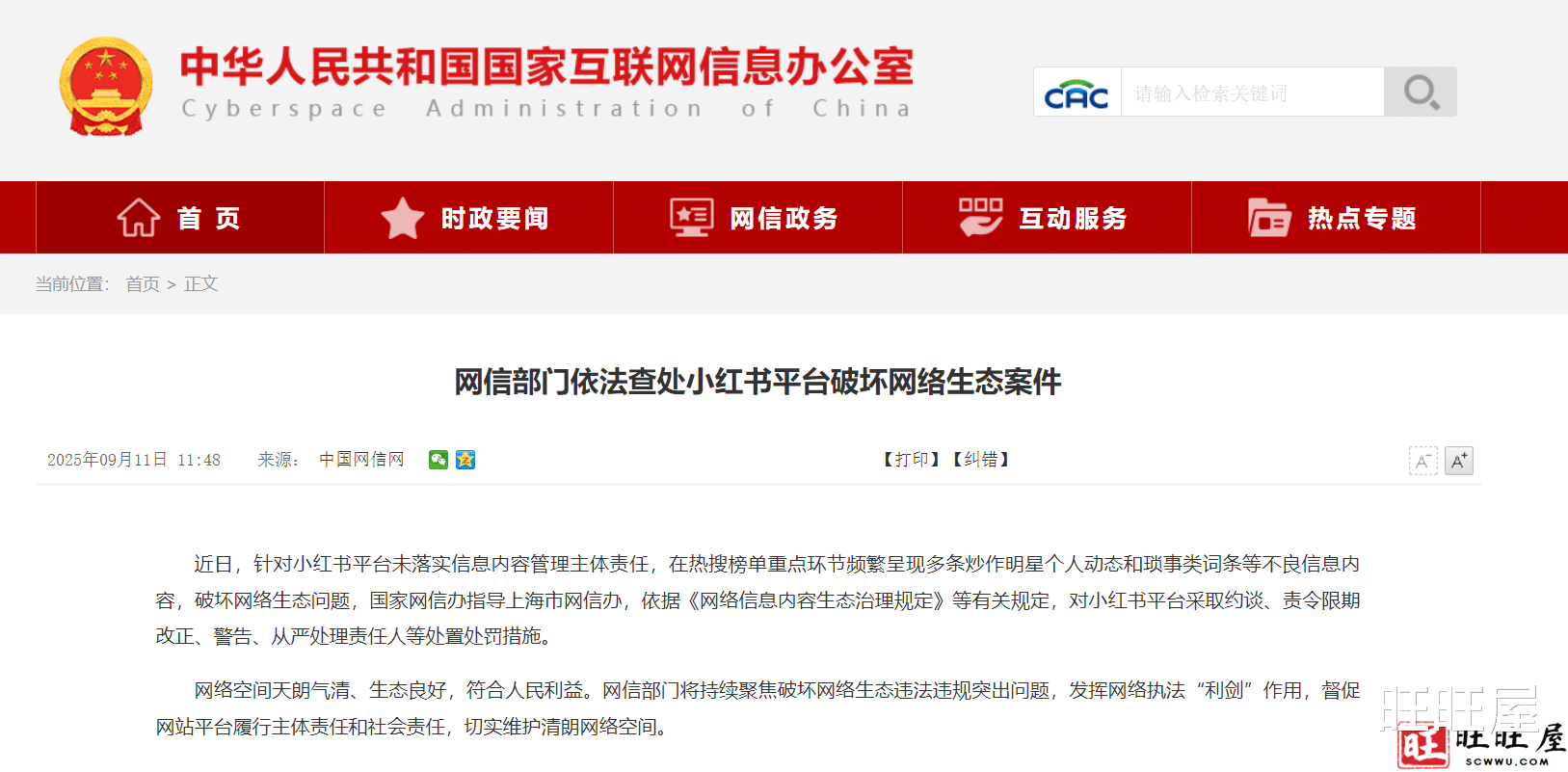 近日,针对小红书平台未落实信息内容管理主体责任,在热搜榜单重点环节频繁呈现多条炒作明星个人动态和琐事类词条等不良信息内容,破坏网络生态问题,国家网信办指导上海市网信办,依据《网络信息内容生态治理规定》等有关规定,对小红书平台采取约谈、责令限期改正、警告、从严处理责任人等处置处罚措施。