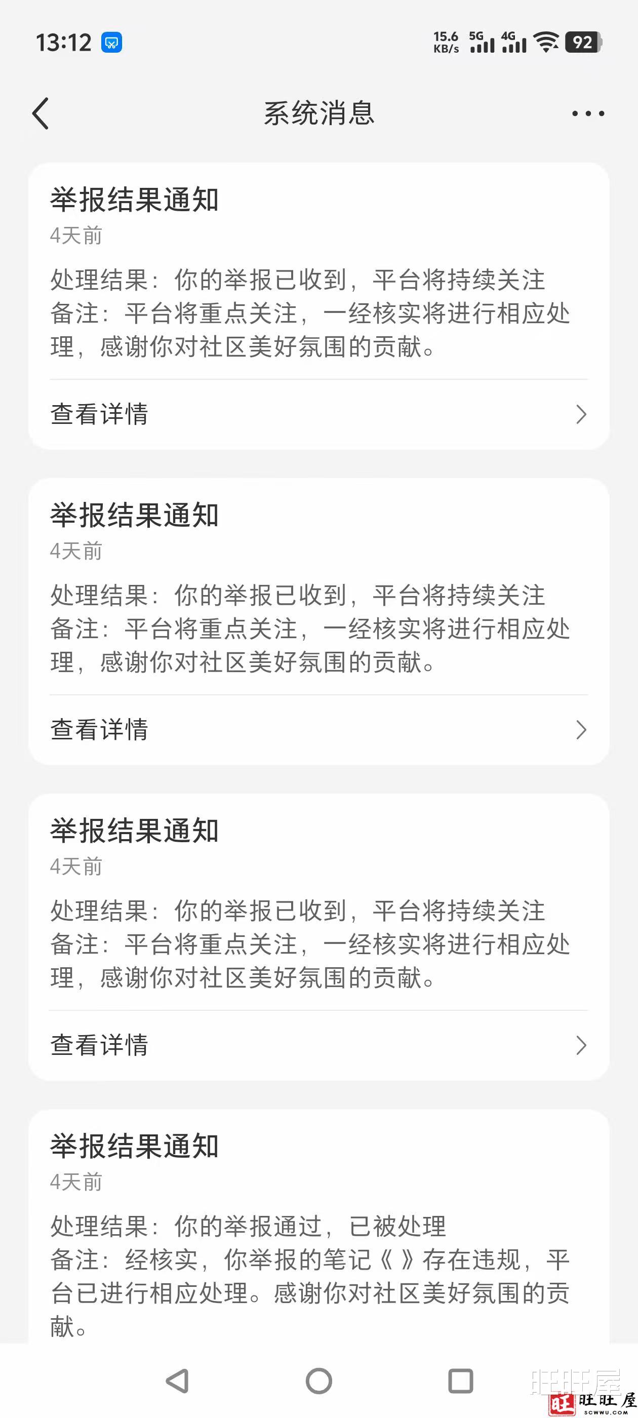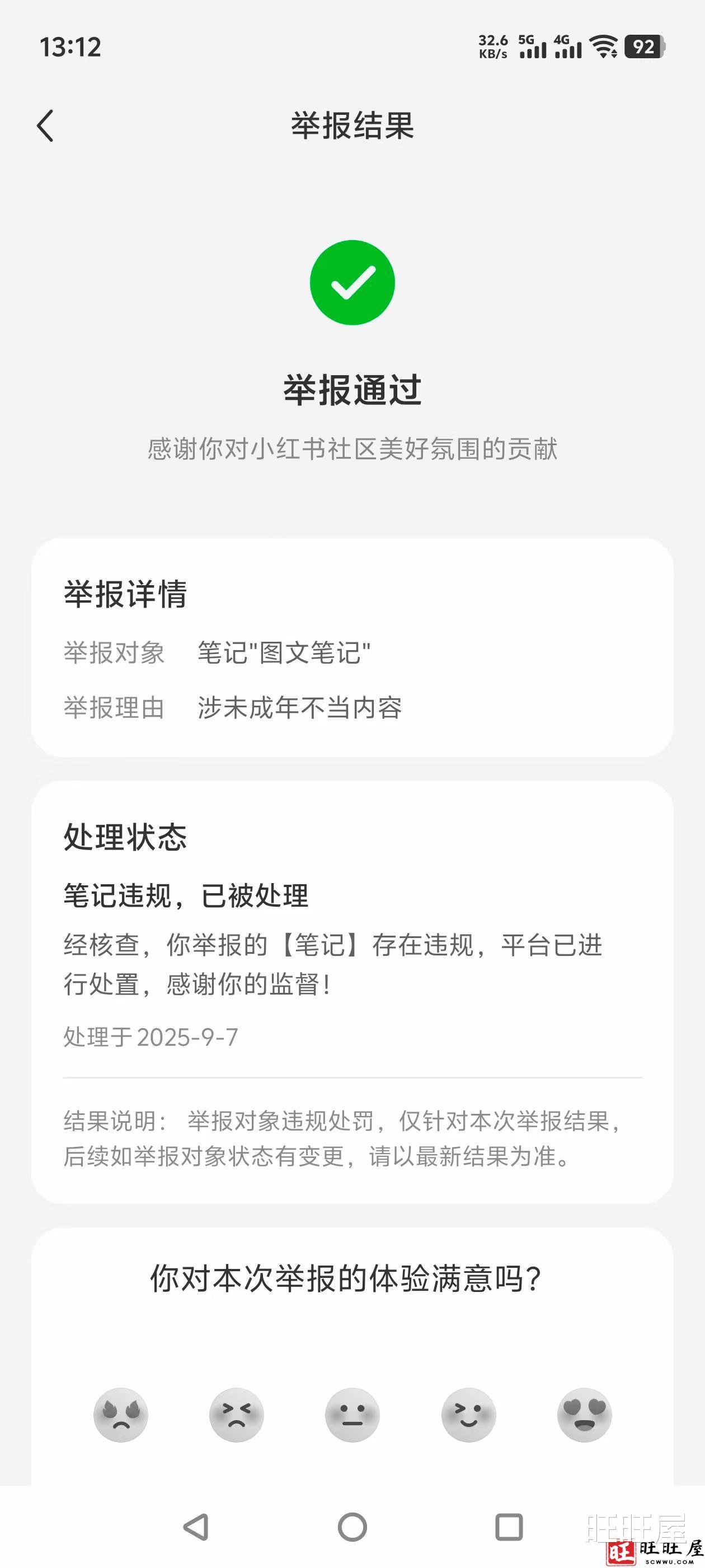 同时旺旺屋还发现,即使你举报通过,内容并没有被下架或删除内容还是存在。你的举报通过,已被处理,备注:经核实,你举报的笔记存在违规,平台已进行相应处理。