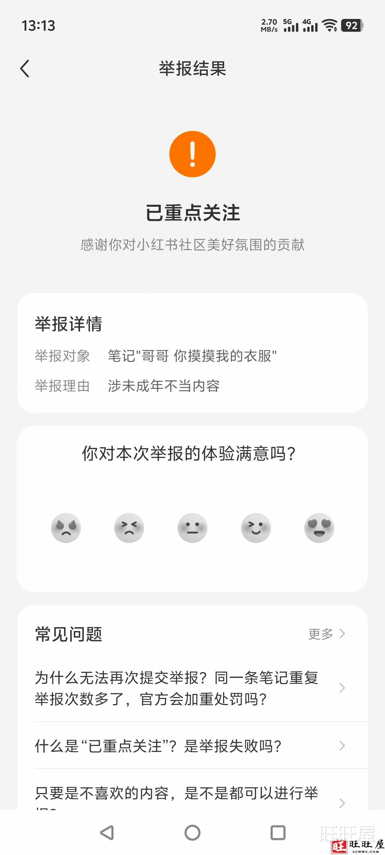 据旺旺屋了解到,小红书平台涉及未成年人色情低俗等内容,而旺旺屋尝试举报这些内容,却告知处理结果,你的举报已收到,平台将持续关注,备注:平台将重点关注,一经核实将进行相应处理。