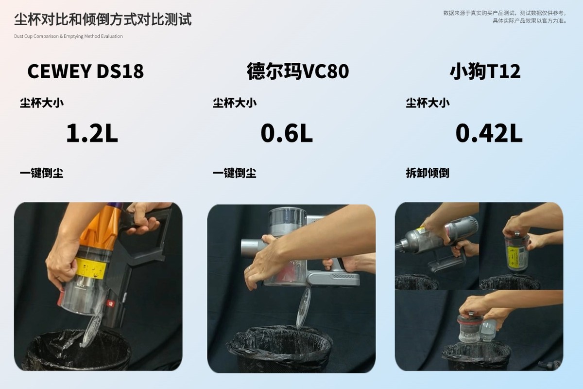 测试总结:尘杯容量与倾倒体验优秀:CEWEY尘杯容量与倾倒体验良好:德尔玛尘杯容量与倾倒体验一般:小狗在这项测试中,CEWEY DS18尘杯容量是最大的有1.2L,足以应对日常全屋清洁。采用一键弹盖式设计,垃圾下落顺畅,几乎无残留,基本上没有出现扬尘的情况,倾倒过程干净利落。德尔玛尘杯容量不算很大,不过倾倒设计比较方便,但在应对细粉尘时,杯壁会有少量附着,需要轻拍或手动处理,扬尘水平略高于CEWEY。小狗的尘杯容量偏小,打扫的时候得经常停下来倒尘,来来回回的,特别不方便,打扫效率都变低了。