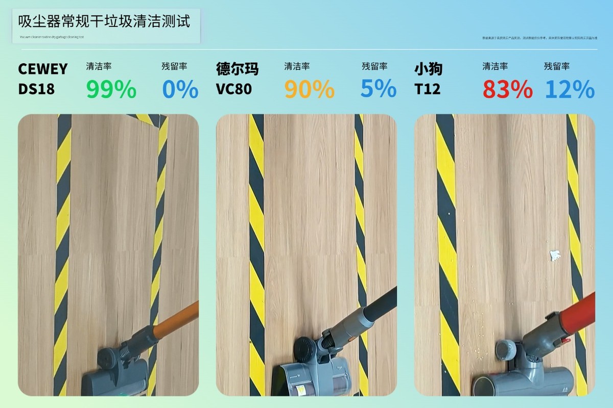 测试总结:一次清洁率优秀:CEWEY一次清洁率良好:德尔玛一次清洁率一般:小狗从实际测试看,CEWEY DS18面对猫砂、瓜子壳和碎纸屑时,一次推扫几乎都能吸干净,滚刷没有出现推飞或者弹飞的现象,清洁表现优秀。CEWEY能有这样的清洁表现,关键在于它搭载的新一代高速无刷电机和复合锥形气旋分离技术的动力系统,能做到同价位行业第一的220AW和35Kpa的超强吸力,配合复合锥形气旋分离技术,过滤系统能实现99%的尘气分离效率,同时高效尘气分离效率也能有效防止滤网堵塞,能持久保持强劲吸力。德尔玛它清理纸屑和瓜子壳的效果还不错,但碰到猫砂这种稍大的颗粒,就会有一定残留,而且清扫的时候偶尔会出现颗粒被刷头崩飞的情况,还得补扫一次才行。