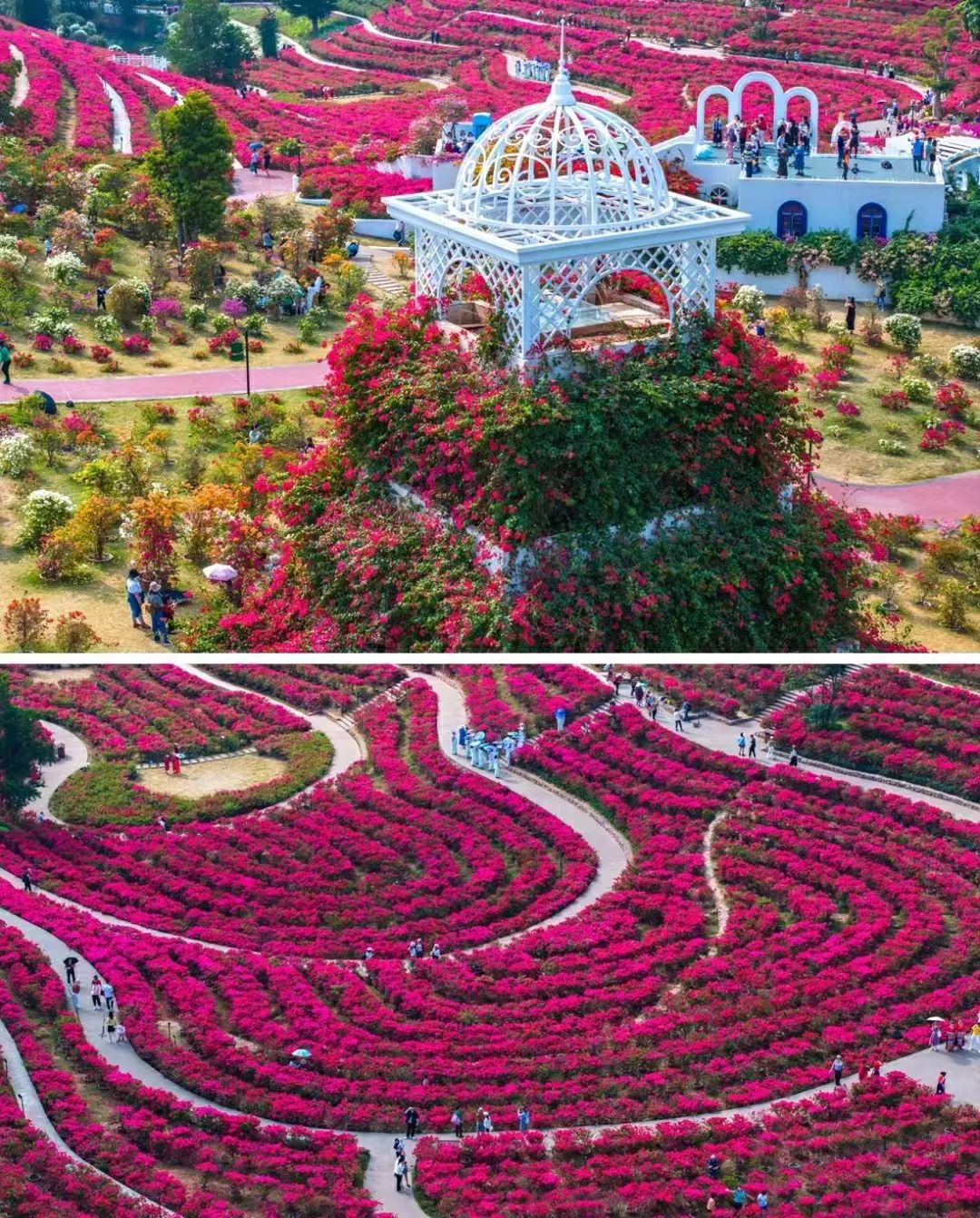 三角梅、樱花、桃花、向日葵、黄花风铃木、郁金香、荷花、美人蕉、格桑花……品类超多,简直就是花卉世界,令游客喜爱不已。