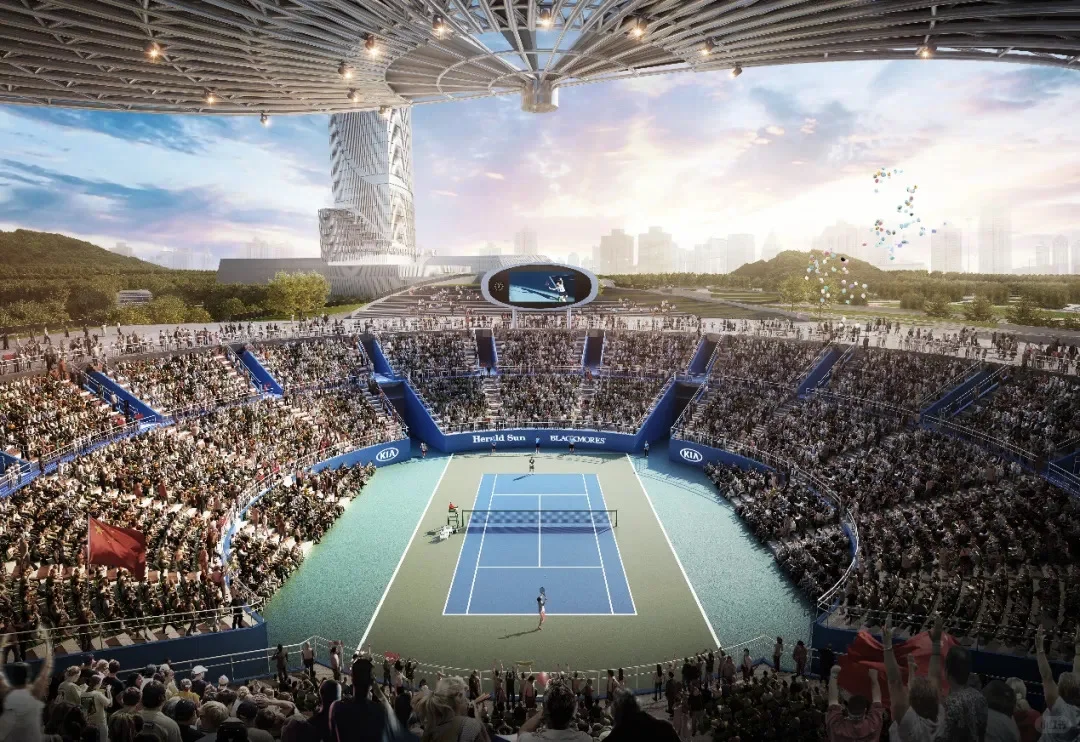 一个运动绿谷设计了两个网球赛事岛和三个全民健身岛,在每个区域都可以尽情的运动。在这个公园里,还有198 米高的总部大楼和专业体育场馆,总部大楼外形像被风吹鼓的帆,建筑的造型很流畅。网球中心球馆的形态像展翅的羽毛,片片交叠,仿若白鹭翱翔于湾畔。
