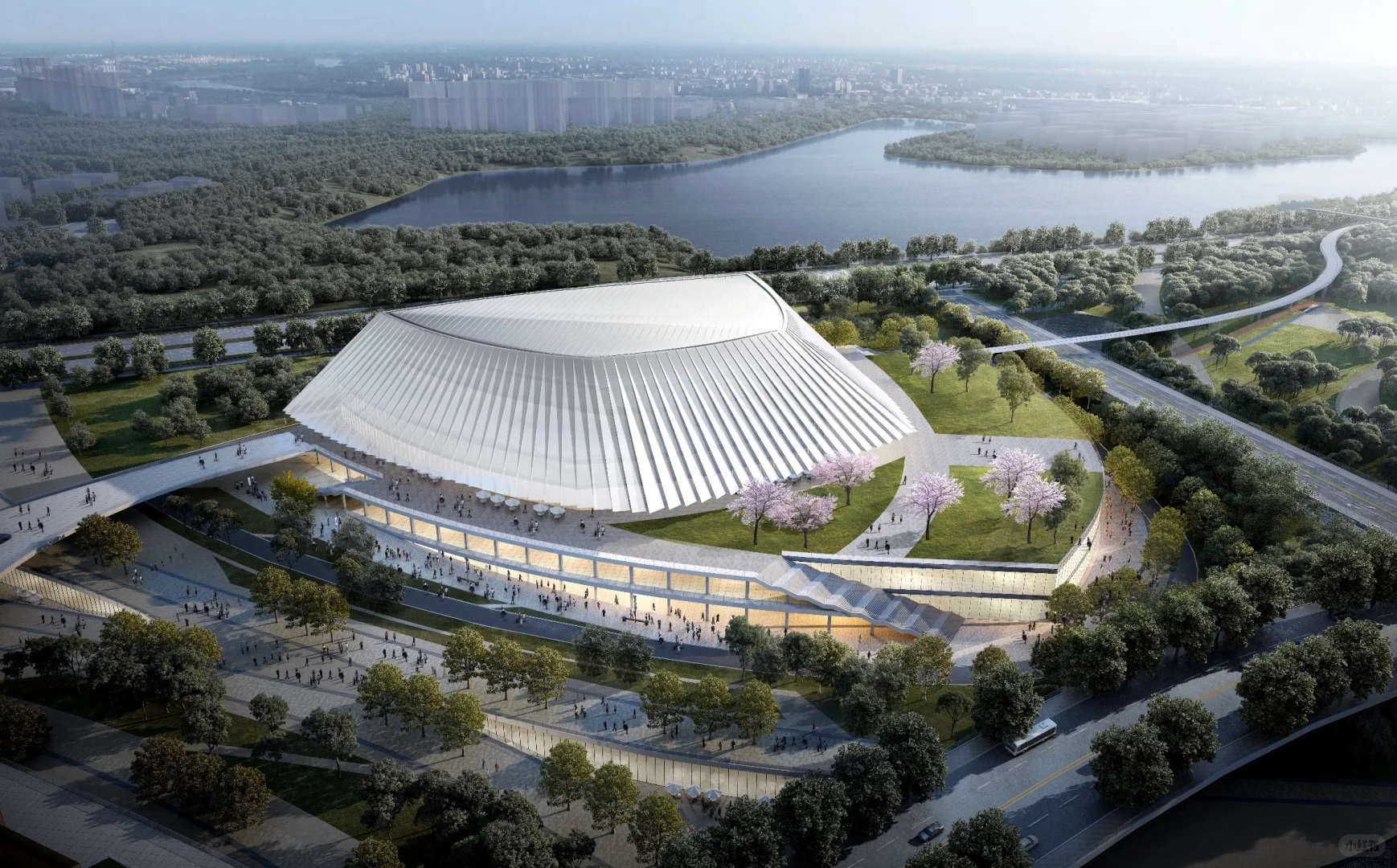 建筑外立面运用大量半透膜材料,看起来非常通透,因为地面上是体育公园又和地铁相接,所有就有了TOD的模式,这个体育公园平时是公众强身健体的地方,如果有重大体育赛事就是体育场,功能很灵活。