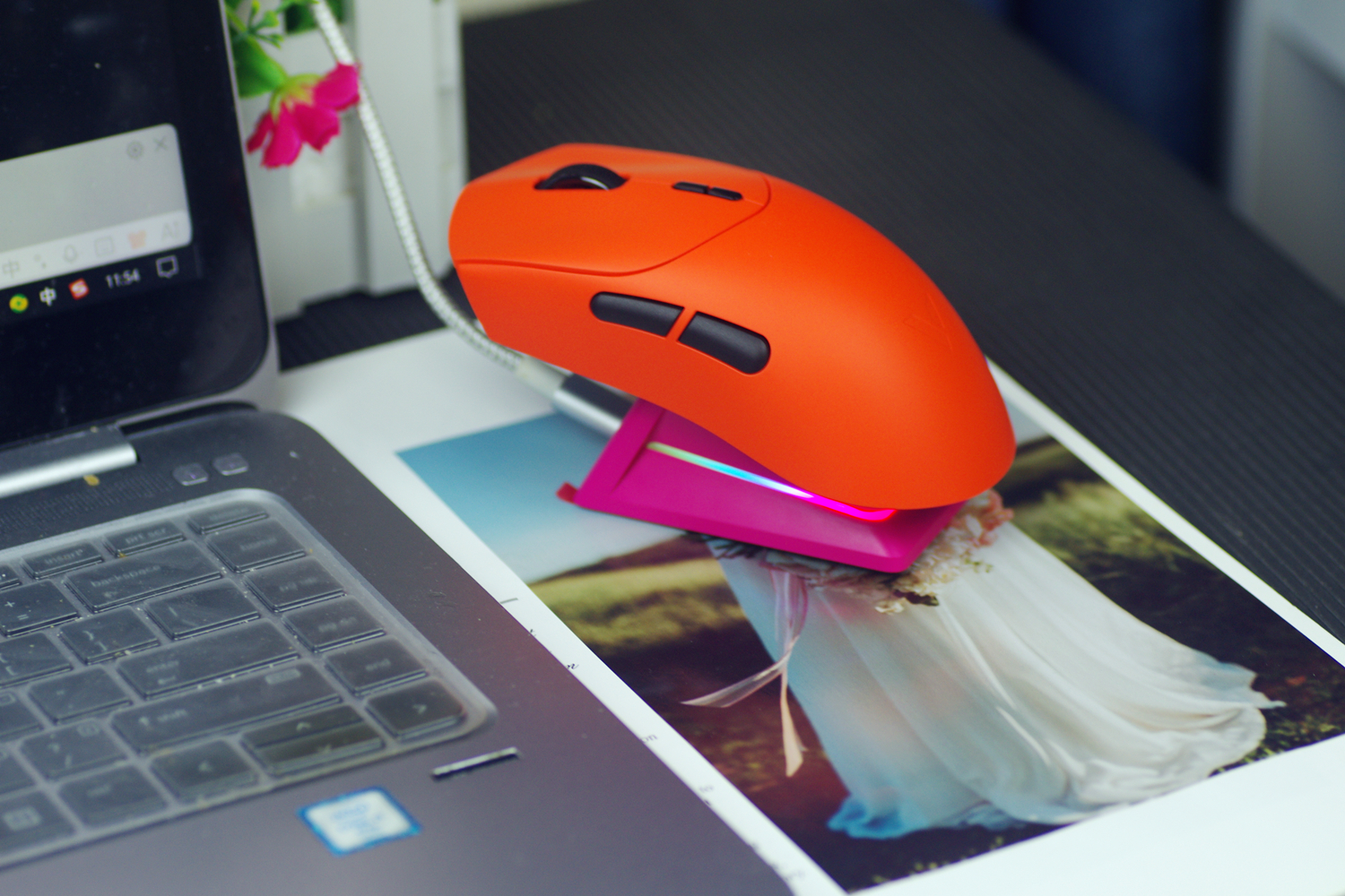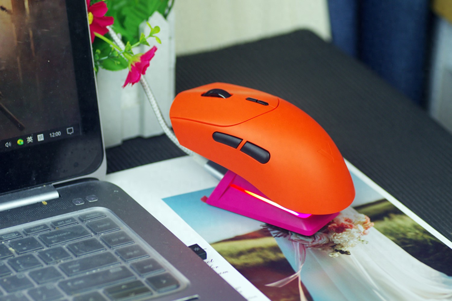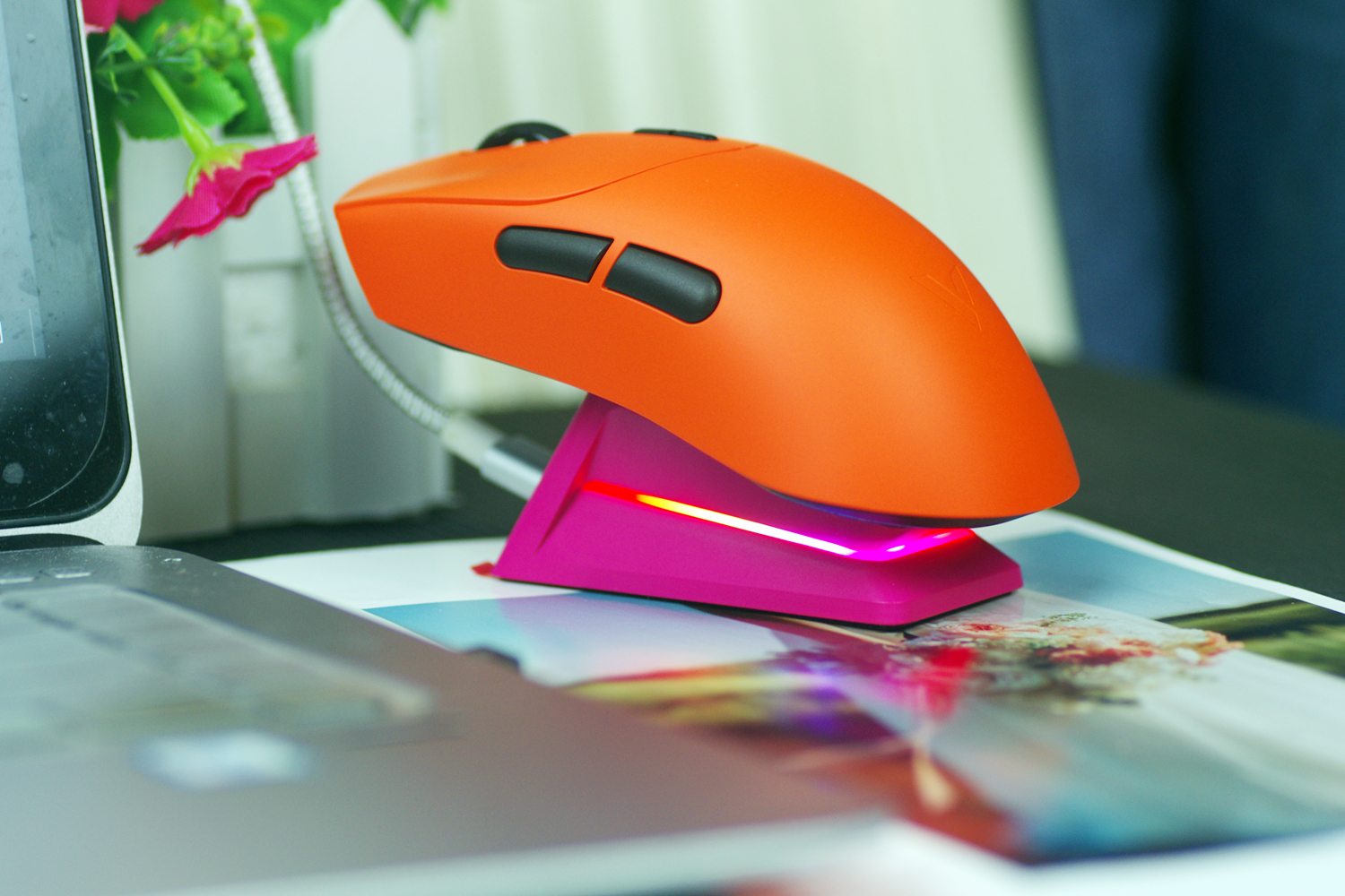 雷柏VT7彻底摆脱了游戏鼠标“非黑即白”的单调套路,主打焰影橙配色,官方定义为“性能猛兽”视觉符号,放在桌面辨识度拉满,搭配树莓粉色P5 PLUS底座,整套桌面电竞氛围直接拉满。