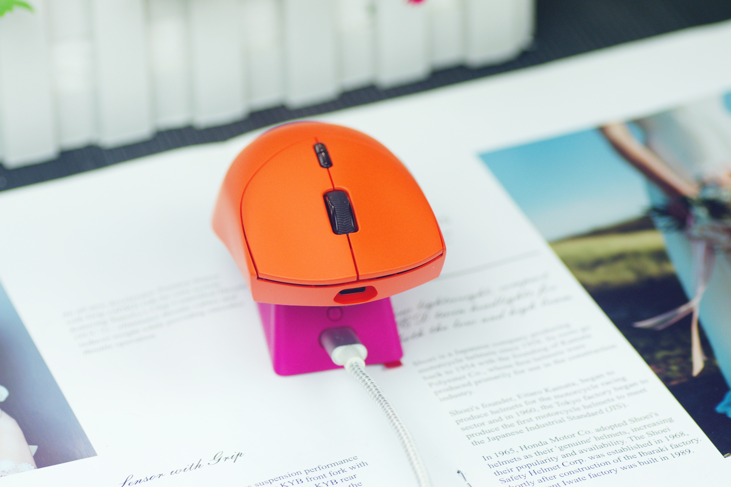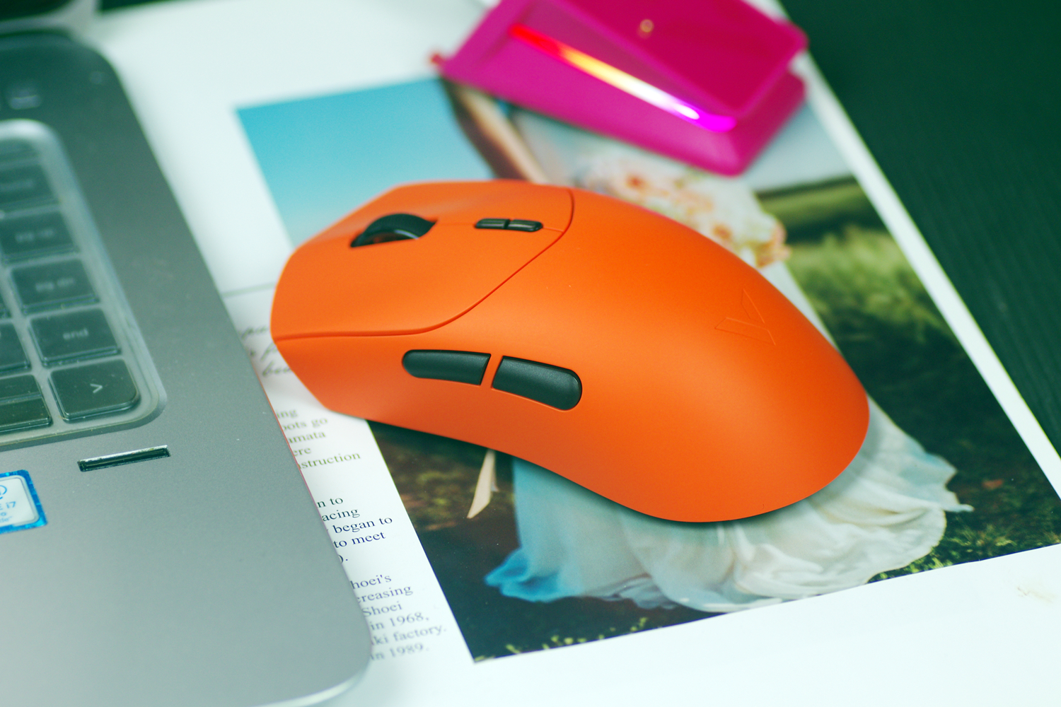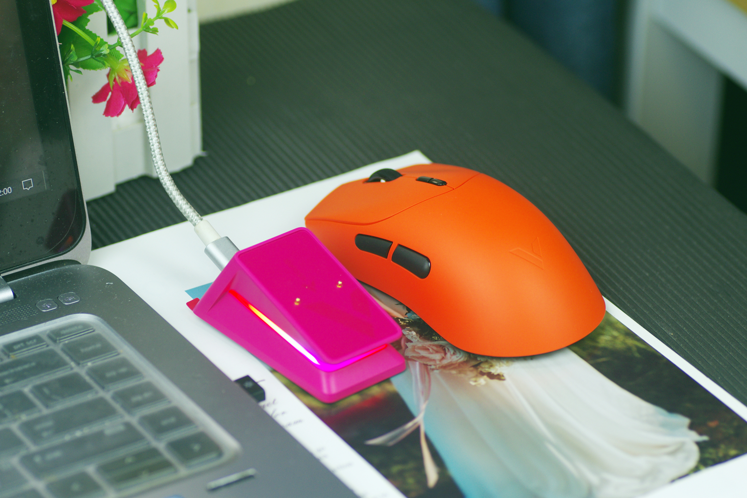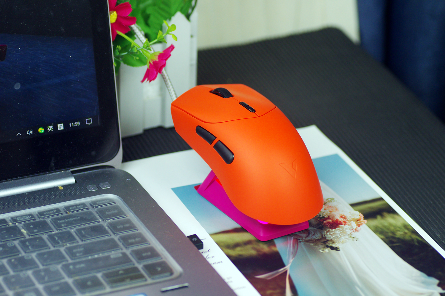 雷柏VT7彻底摆脱了游戏鼠标“非黑即白”的单调套路,主打焰影橙配色,官方定义为“性能猛兽”视觉符号,放在桌面辨识度拉满,搭配树莓粉色P5 PLUS底座,整套桌面电竞氛围直接拉满。