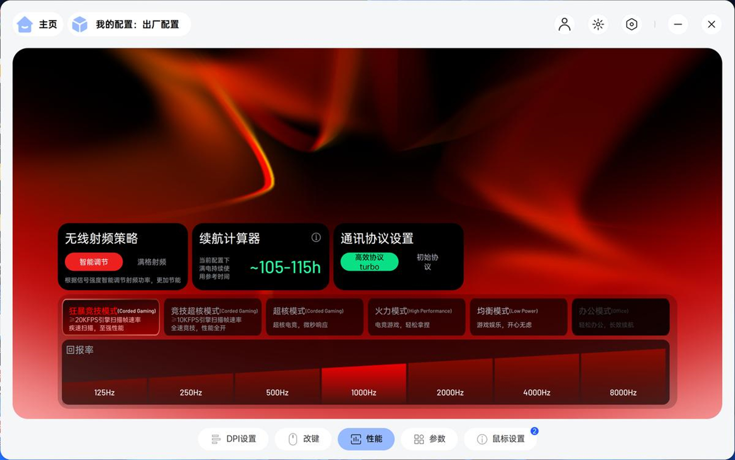驱动内置六大性能模式,自动适配不同场景,还支持配置文件跟随应用切换,打开游戏自动切换电竞模式,关闭游戏切回均衡模式,智能省电又不牺牲性能。狂暴竞技模式:≥20000FPS扫描速率,职业FPS专属;竞技超核模式:≥10000FPS扫描速率,高强度排位专用;超核/火力/均衡/办公模式:平衡性能与续航,日常使用首选。