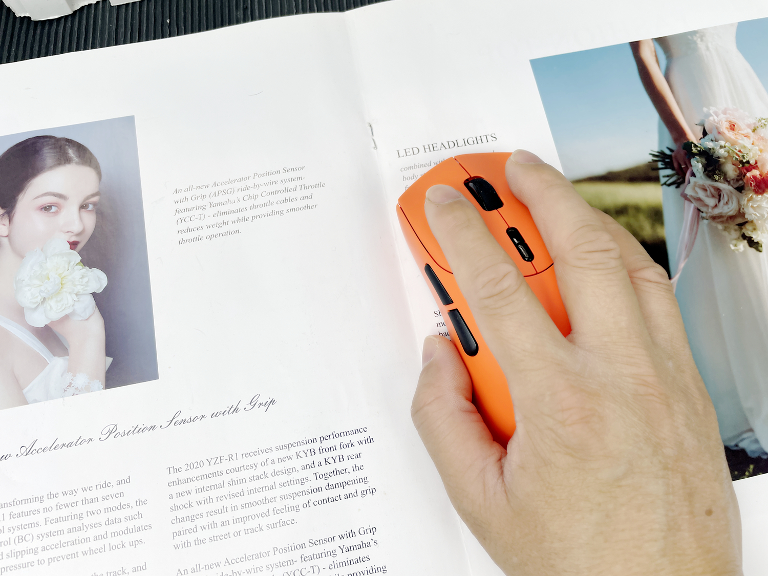 鼠标趴握、抓握、指握都能完美适配:趴握时掌心完全贴合,放松不费力;抓握时两侧弧度提供足够摩擦力,操控灵活;指握时轻量化机身配合紧凑结构,急停急转毫无拖沓。作为主打FPS的“狙击鼠皇”,甩狙、定位、跟枪时,鼠标与手掌完全融为一体,没有丝毫异物感,操控精度直接提升一个档次。