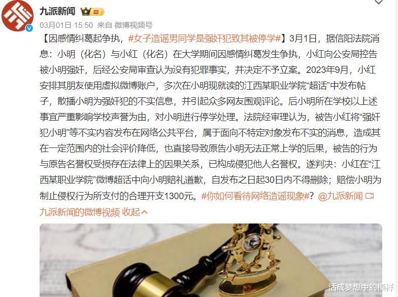 女生造谣男方导致男生被学校停学,男方耽误了学习,耽误了时间,还承受了巨大的舆论压力和精神损失,结果一个道歉和1300块了事。而苏大一男学生P图造谣事件,上了十几条热搜不说,还直接被开除和拘留。