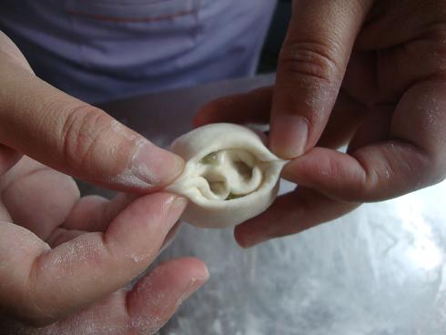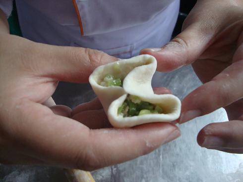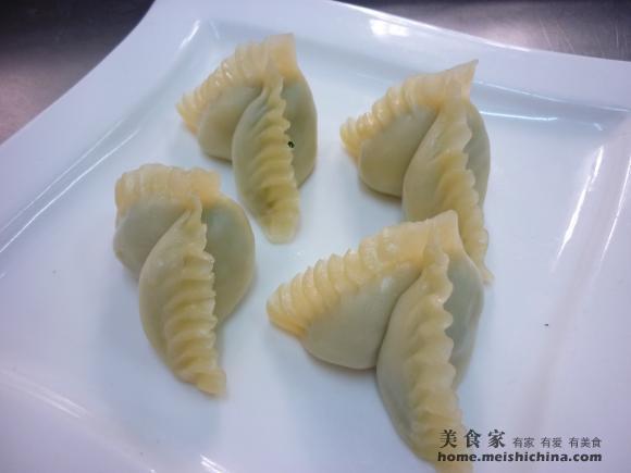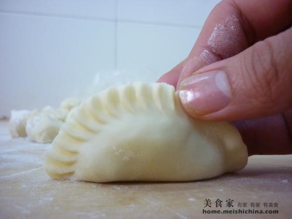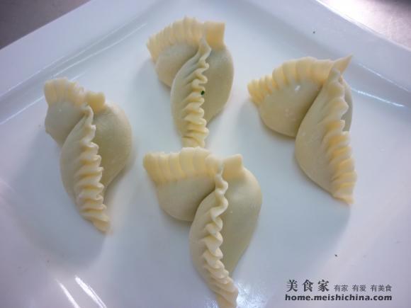 包入菜馅,捏成月牙饺。