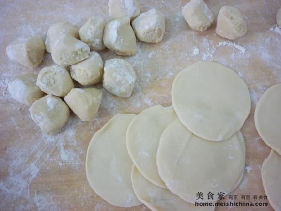 面粉用开水冲烫揉成面团【做蒸饺的面团一般都用开水和面,这样面团筋度减小,可塑性强,利于造型】。下剂子,擀成圆皮。