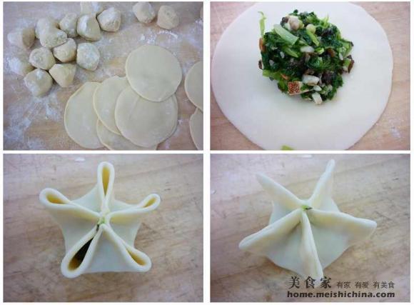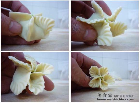 把面团搓条,下剂子擀皮,包入馅心。把圆皮均分5点,粘在一起形成5条边,把口捏紧。