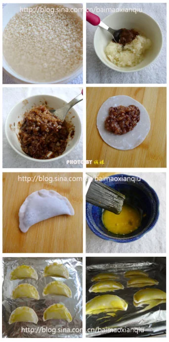 4、取适量糯米巧克力酱馅料放入饺子皮中,折成月牙状,紧实捏合起来,顺序放入烤盘中,每只上方均匀刷上蛋液,将烤盘放入预热的烤箱中;