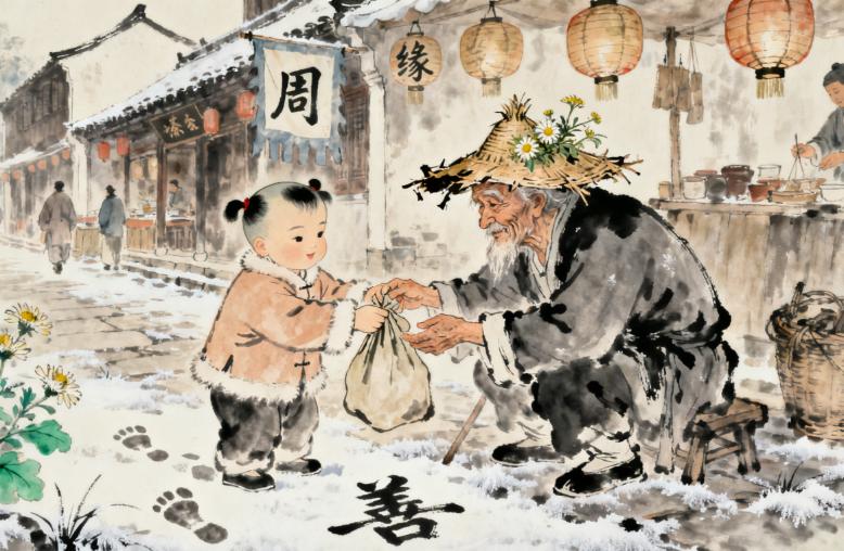 老乞丐愣了一下,抬头看着阿福,眼里满是感激,连忙接过布袋子,颤巍巍地说:“谢谢,谢谢你啊,小伙子,你真是个好心人。”阿福笑了笑,说道:“不用客气,您快拿着吧,天这么冷,别冻着了。” 说完,他就转身去粮铺上工了。让阿福没想到的是,这件事没过几天,就给家里带来了好运。