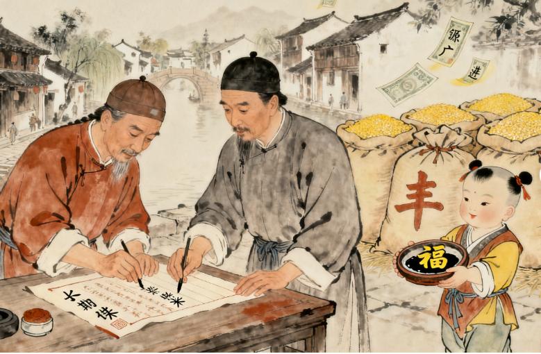 那天下午,阿福正在粮铺里给客人称米,突然看见一个穿着体面的中年男人走进来,身后还跟着两个随从。男人径直走到柜台前,对王掌柜说道:“请问您是‘诚信粮铺’的王掌柜吗?”王掌柜连忙起身,笑着说:“正是在下,不知先生找我有何事?”