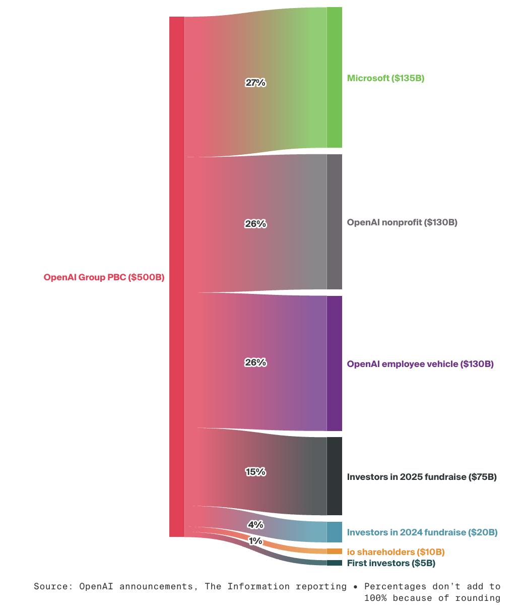 OpenAI的重组稀释了早期投资者持有的股份价值,因为它授予了非营利部门OpenAI基金会26%的股份。股东不会对OpenAI的运营方式发表意见,但该交易取消了他们从拥有股份中可能获得的潜在财务回报的先前上限。