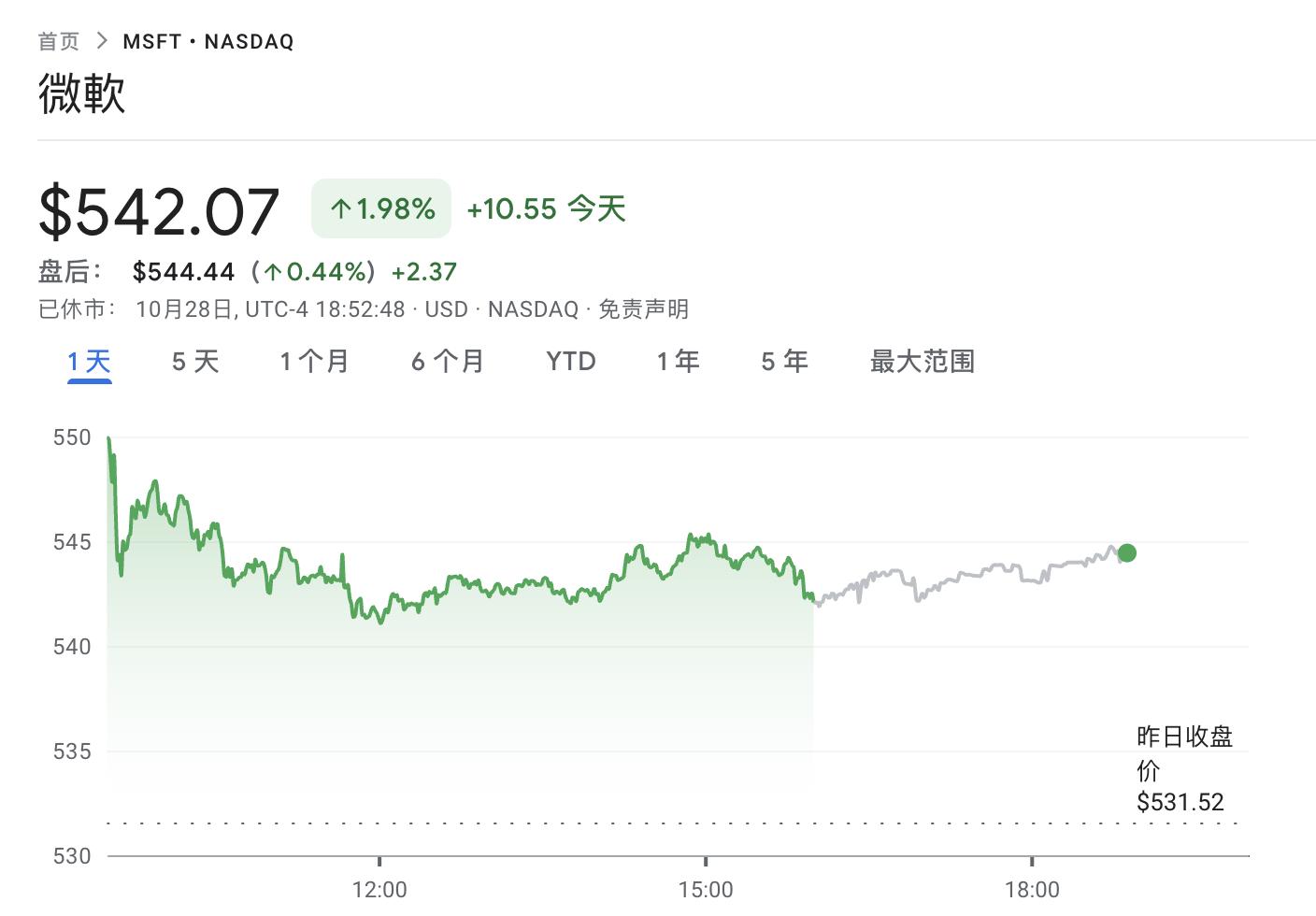 截至10月28日收盘,微软股价最高上涨1.98%。