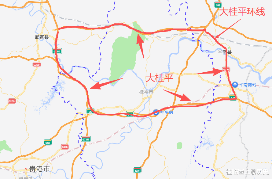 打开地图可以发现,围绕桂平主城区,东南西北方向的高速路已然闭合,刚好把其包裹其中,这简直就是桂平的天然“绕城高速”!