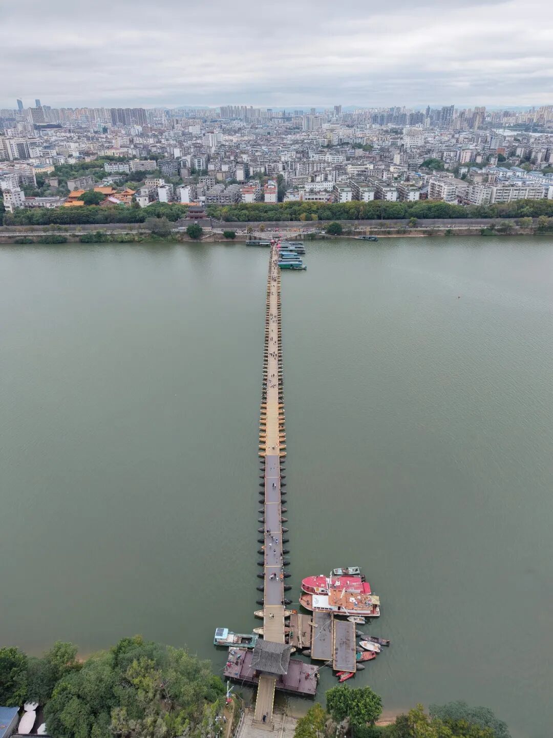 东津桥历史悠久,始自南宋年间,全长约400米,由100条木舟连接而成,是赣州这座城市的地标。
