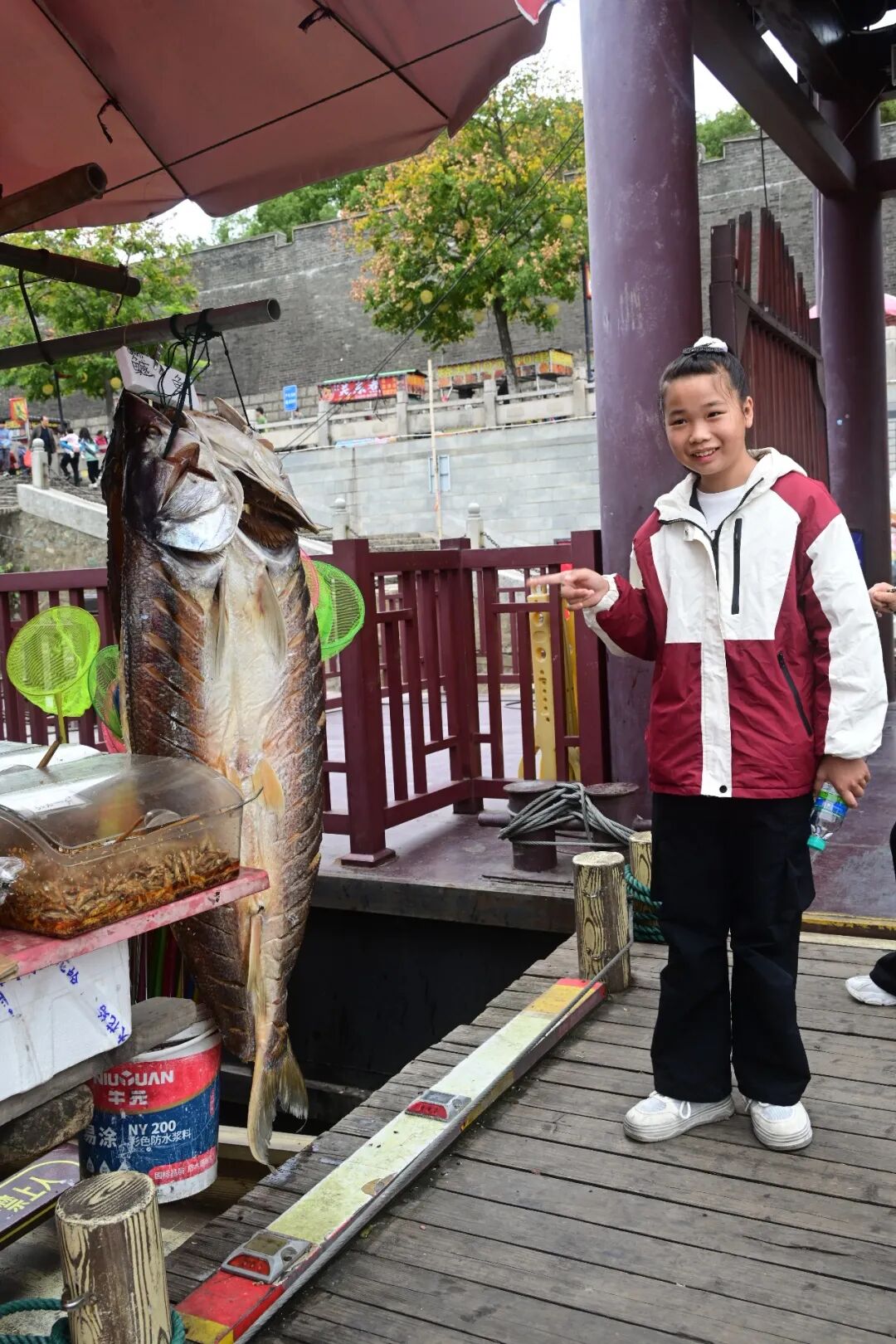桥东头有桥市,总共七、八家,主要是卖鱼,最常见的是翘嘴和鱤鱼,这条和小朋友一样高的鱤鱼成了桥市的明星。