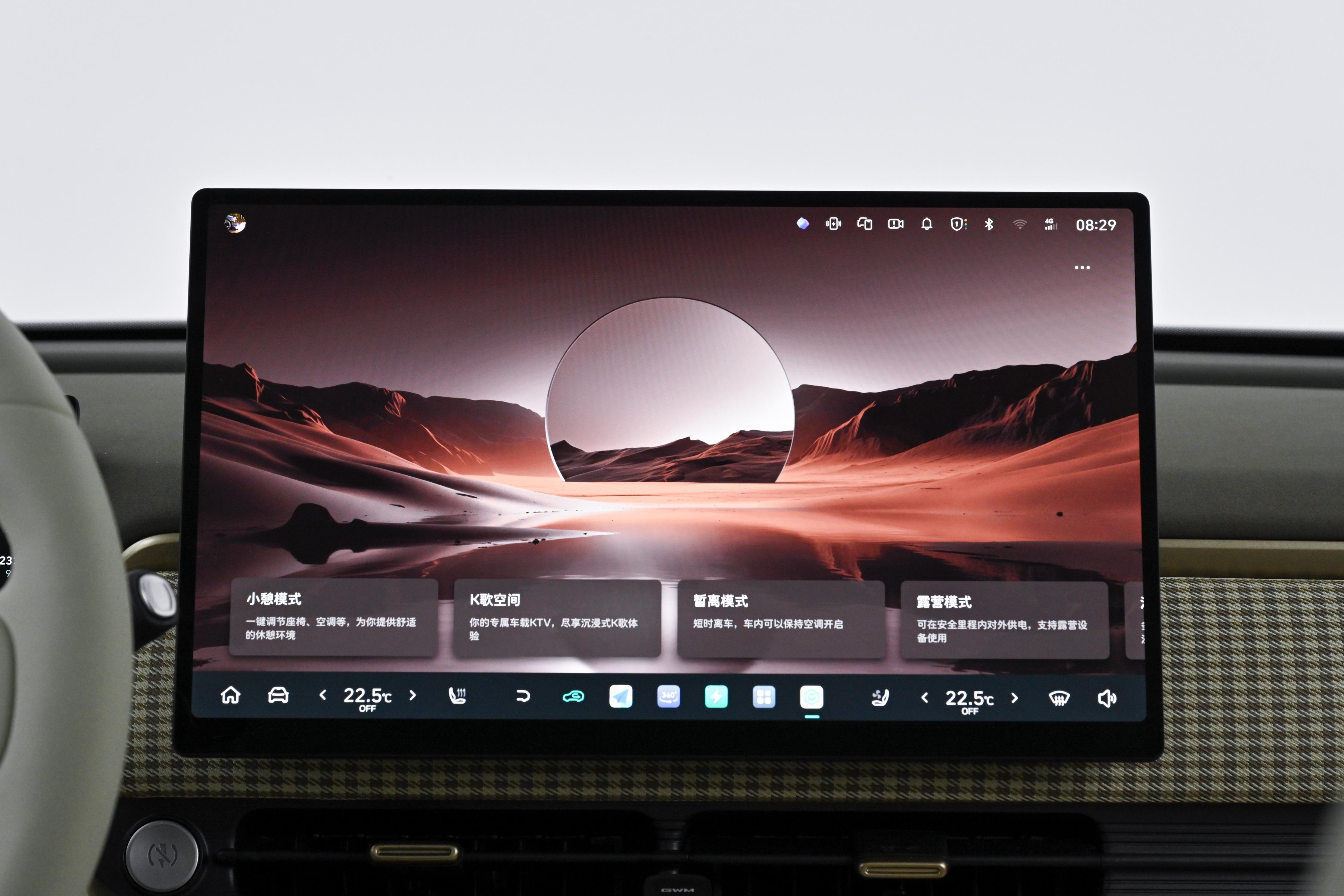 接下来我们来到车内,欧拉5的内饰造型还是比较有设计感的,俨然一副精致小车的模样。在配色上之前我们拍摄到了黑色、白色和米色等三种不同的配色,三种不同的风格来适配不同人群的喜好。另外简洁的双辐式方向盘也是家族特色,搭配全系10.25+15.6英寸的双屏,在智慧座舱部分Coffee OS也上车了,配置表现也是相当主流。