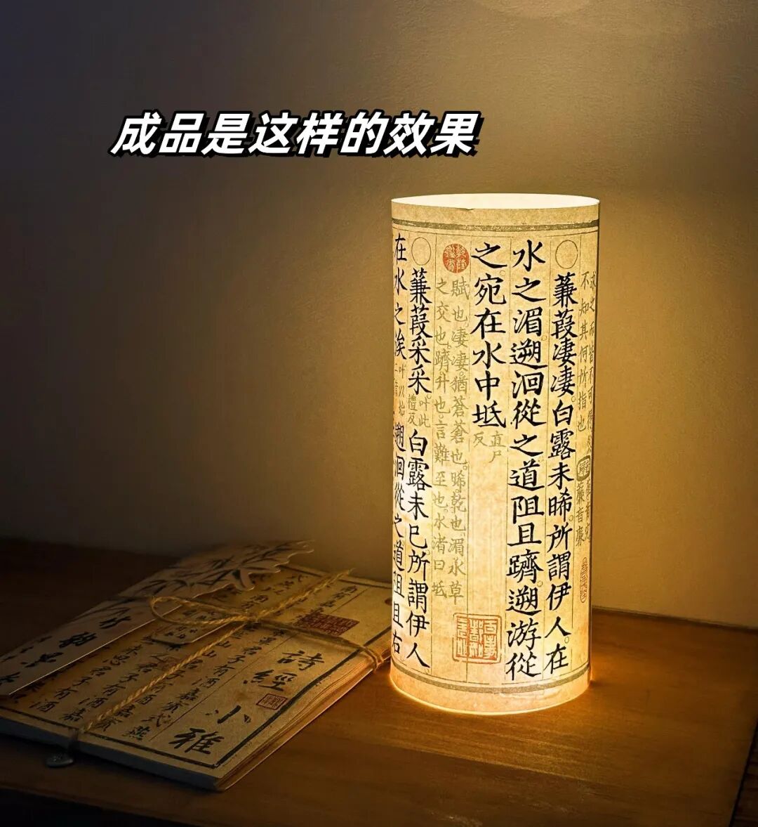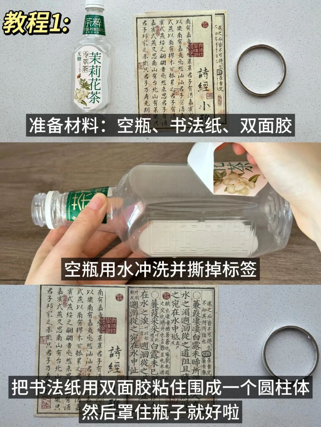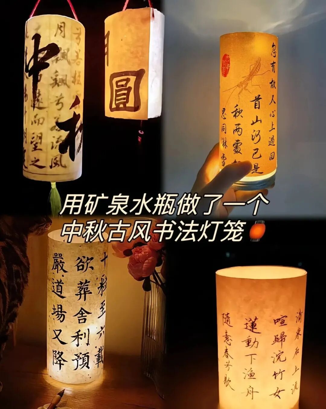 喜欢动手捣鼓的宝子们,第一种,把空饮料瓶的标签撕掉,然后把自己买的书法纸围成一个圆柱体,罩住瓶子,最后在瓶子里塞上灯串,一盏古风小夜灯就做好了。