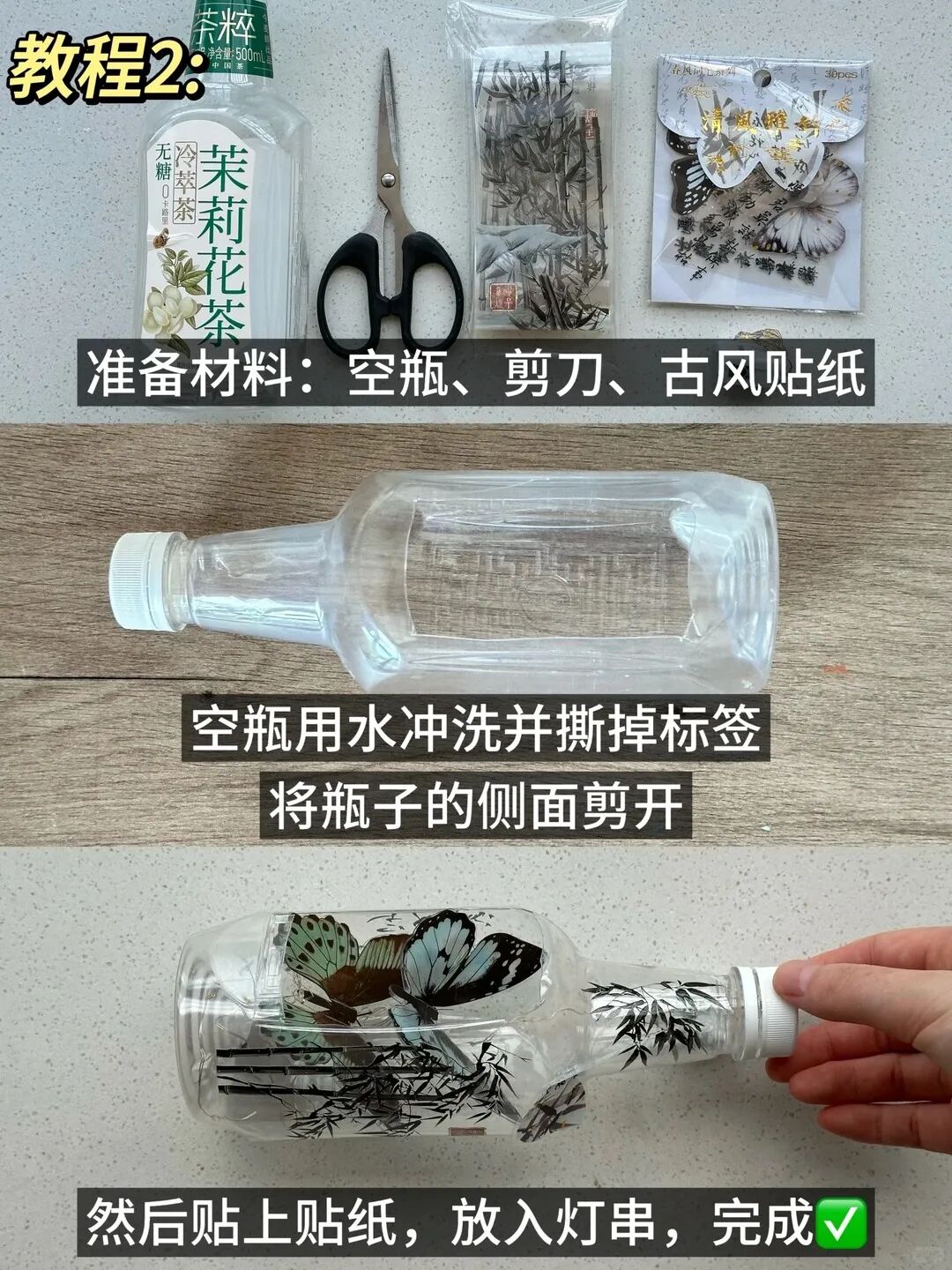 第二种,把空饮料瓶的侧面剪开,在里面贴上古风贴纸,然后放上灯串,同样好看。