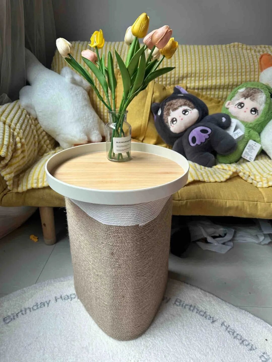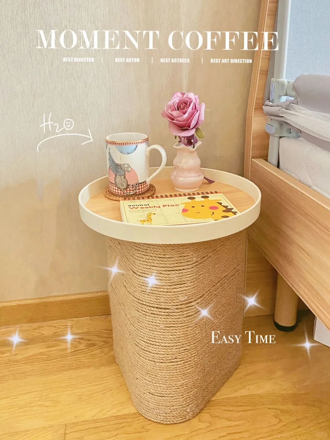 首先,把奶粉罐清洗干净,用胶带缠在一起,外围用纸板裹一层,接着用胶枪把麻绳一圈圈地缠绕上去,最后在奶粉罐的顶部放上圆托盘,一个小茶桌就做好了。