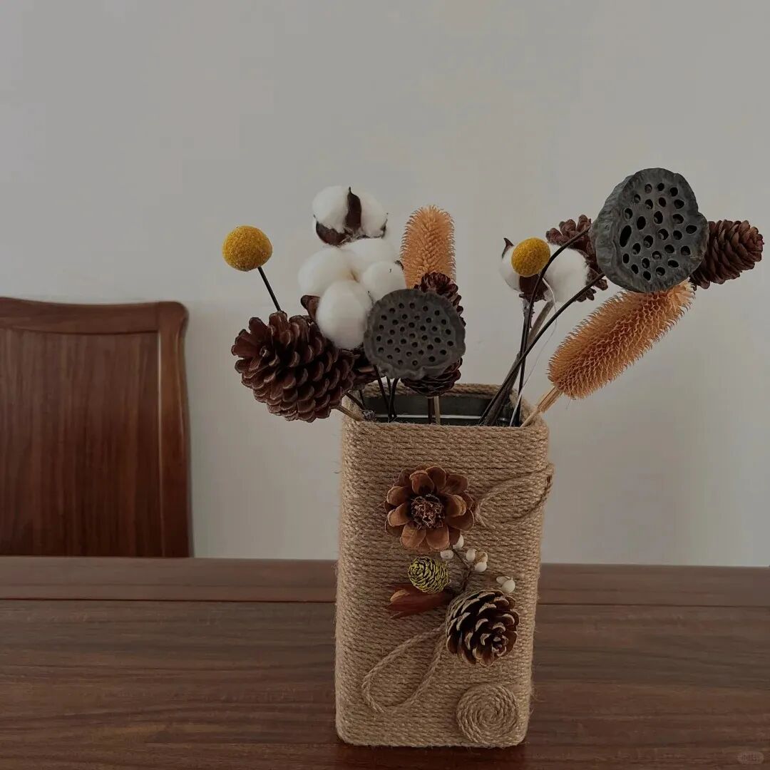 也可以粘贴上蝴蝶结或者纽扣之类的小饰品,搭配上干花,一个复古风的花瓶装饰完美出炉!