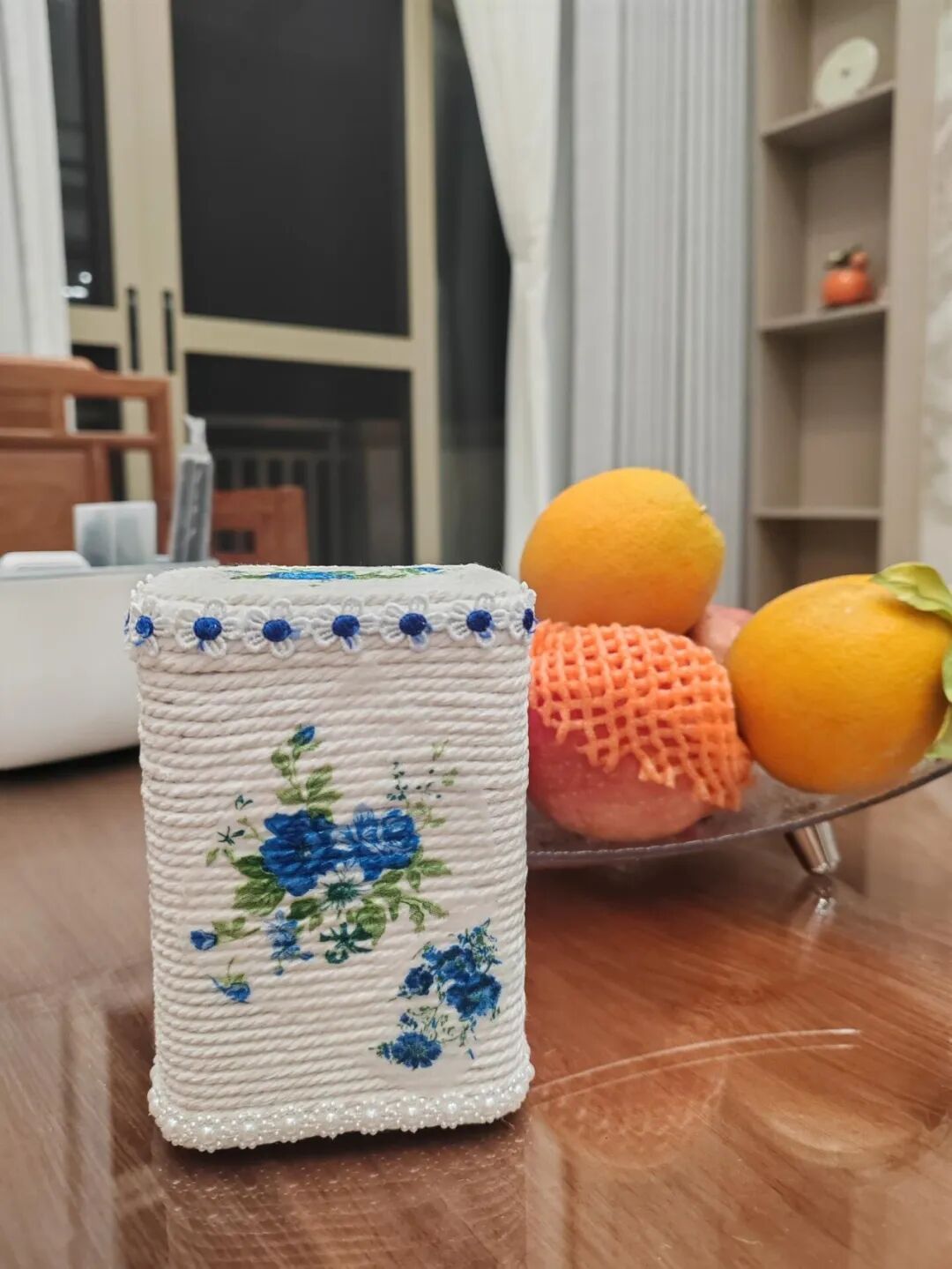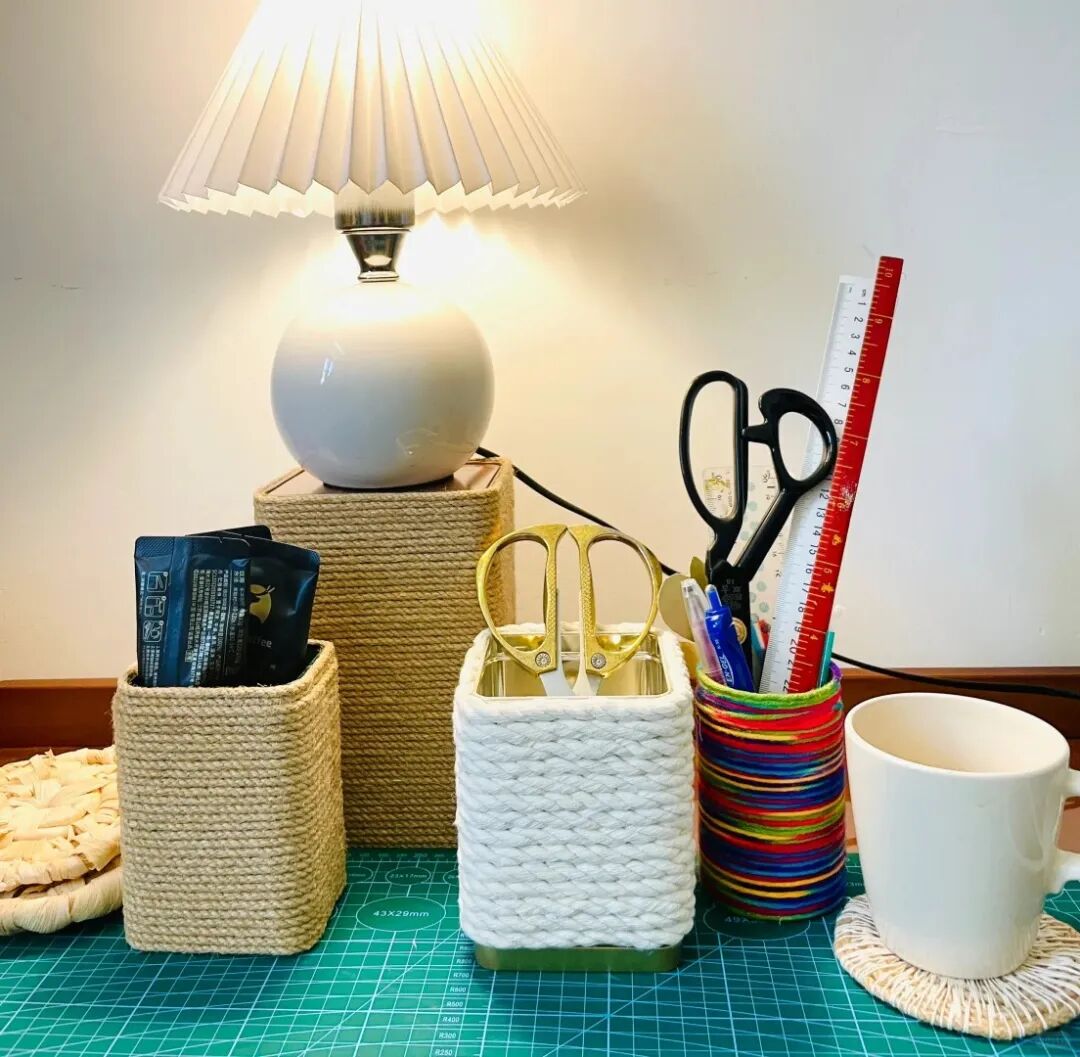 用热熔胶或者502胶水固定麻绳,将其缠绕在茶叶罐上,一个颜值超高的桌面收纳罐就做好了。