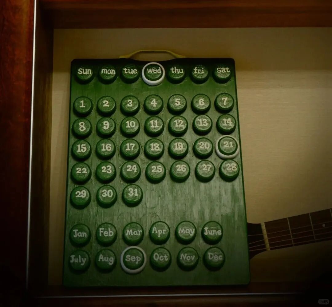 用胶枪打在瓶盖四个点,然后稍微按压一下粘在一个准备的背景板上,然后用丙烯颜料上色,在瓶盖上写上日期和月份,就做好了。