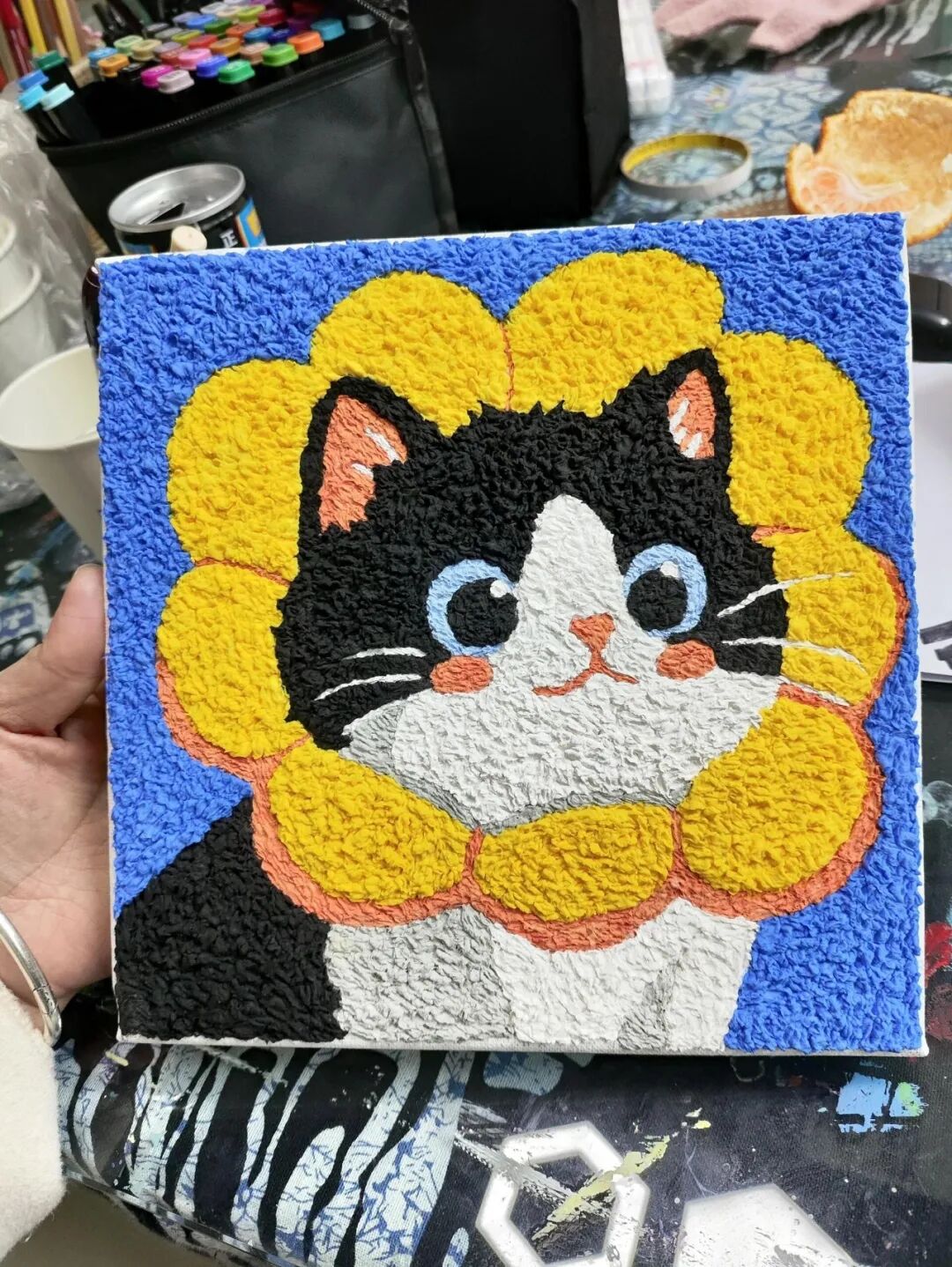 再把攥干的纸一点点拆开,倒入白乳胶,和成面团状,最后用颜料调色后就可以一点点黏在纸上,创作属于自己的艺术画了。