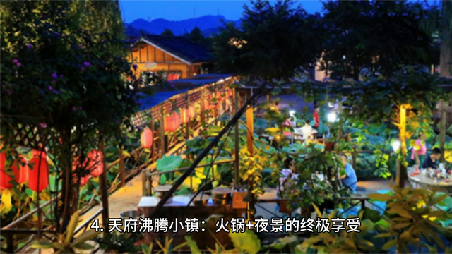 ·4.天府沸腾小镇:火锅+夜景的终极享受。傍晚到玛歌庄园坐在湖边吃火锅,看灯光秀和水上表演,麻辣鲜香中感受成都的烟火气。记得提前订位临湖座位更抢手。